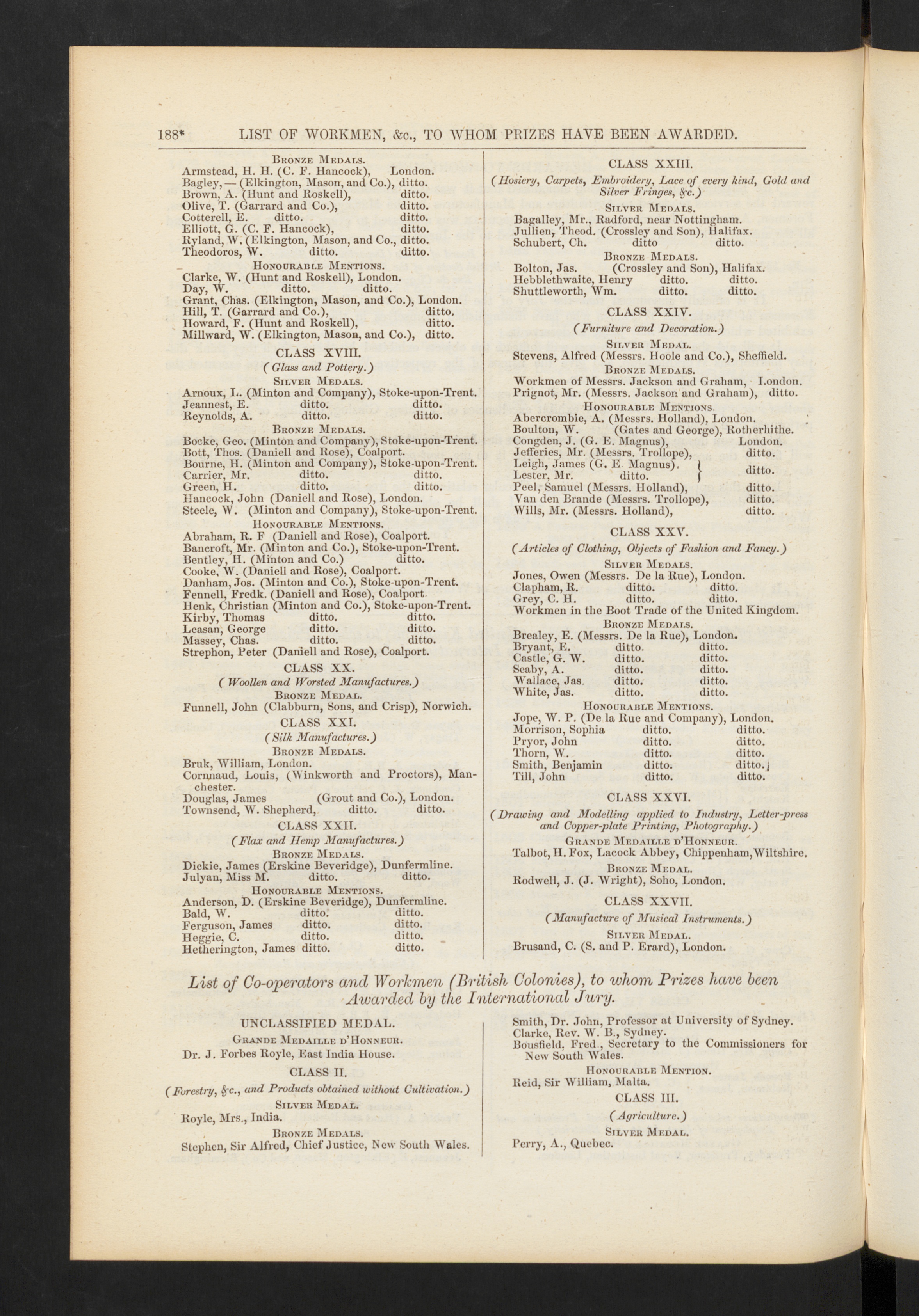 List of Co-operators and Workmen (British Colonies), to whom Prizes have beenAwarded by the International Jury.