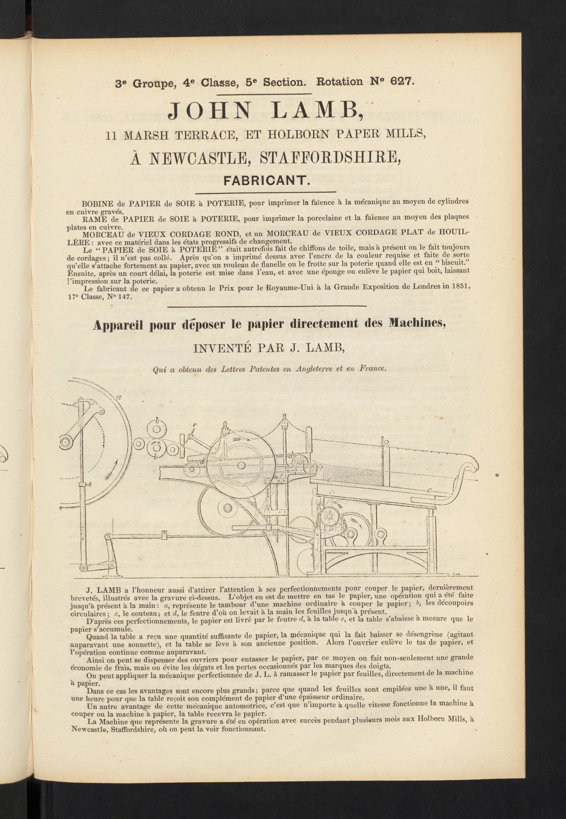 Le fabricant de ce papier a obtenu le Prix pour le Royaume-Uni a la Grande Exposition de Londres in 1851,17 e Classe, N° 147.