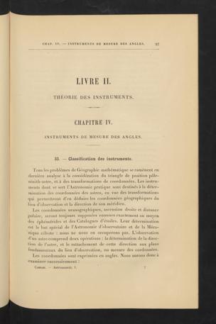 Les coordonnées uranographiques, ascension droite et distancepolaire, seront toujours supposées connues exactement au moyendes éphémérides et des Catalogues d’étoiles. Leur déterminationest le but spécial de l'Astronomie d’observatoire et de la Méca-nique céleste : nous ne nous en occuperons pas. L’observationd’un astre comprend deux opérations : la détermination delà direc-tion de l’astre, et le rattachement de cette direction aux plansfondamentaux du lieu d’observation, ou mesure des cordonnées.