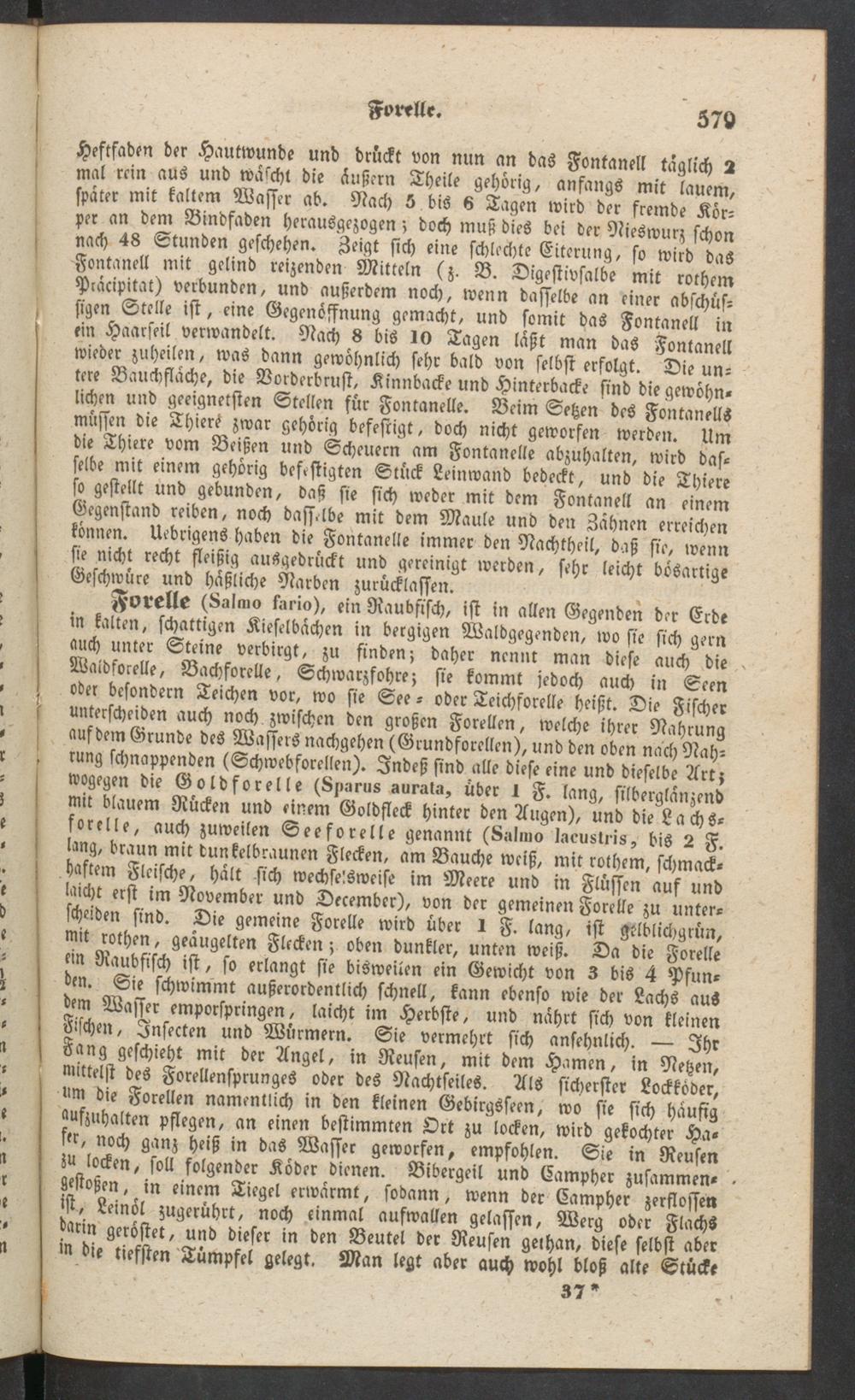 ^ mit rothen, geäugelten Flecken; oben dunkler, unten weiß. Da die Forelleein Raubfisch ist, so erlangt sie bisweilen ein Gewicht von Z bis 4 Pfun-den. Sie schwimmt außerordentlich schnell, kann ebenso wie der Lachs auSdem Wasser emporspringen, laicht im Herbste, und nährt sich von kleinen8>schm, Jnsecten und Würmern. Sie vermehrt sich ansehnlich. — IhrFang geschieht mit der Angel, in Reusen, mit dem Hamen, in Netzen,mittelst des Forellensprunges oder des Nachtseiles. Als sicherster Lockköder,um die Forellen namentlich in den kleinen Gebirgsseen, wo sie sich häufigauszuhalten pflegen, an einen bestimmten Ort zu locken, wird gekochter Ha-sir, noch ganz heiß in das Wasser geworfen, empfohlen. Sie in Reusenzu locken, soll folgender Köder dienen. Bibergeil und Eampher zusammen-gestoßen, in einem Tiegel erwärmt, sodann, wenn der Eampher zerflossenist, Leinöl zugerührt, noch einmal aufwallen gelassen, Werg oder Flachsdarin geröstet, und dieser in den Beutel der Reusen gethan, diese selbst aberin die tiefsten Tümpfel gelegt. Man legt aber auch wohl bloß alte Stücke