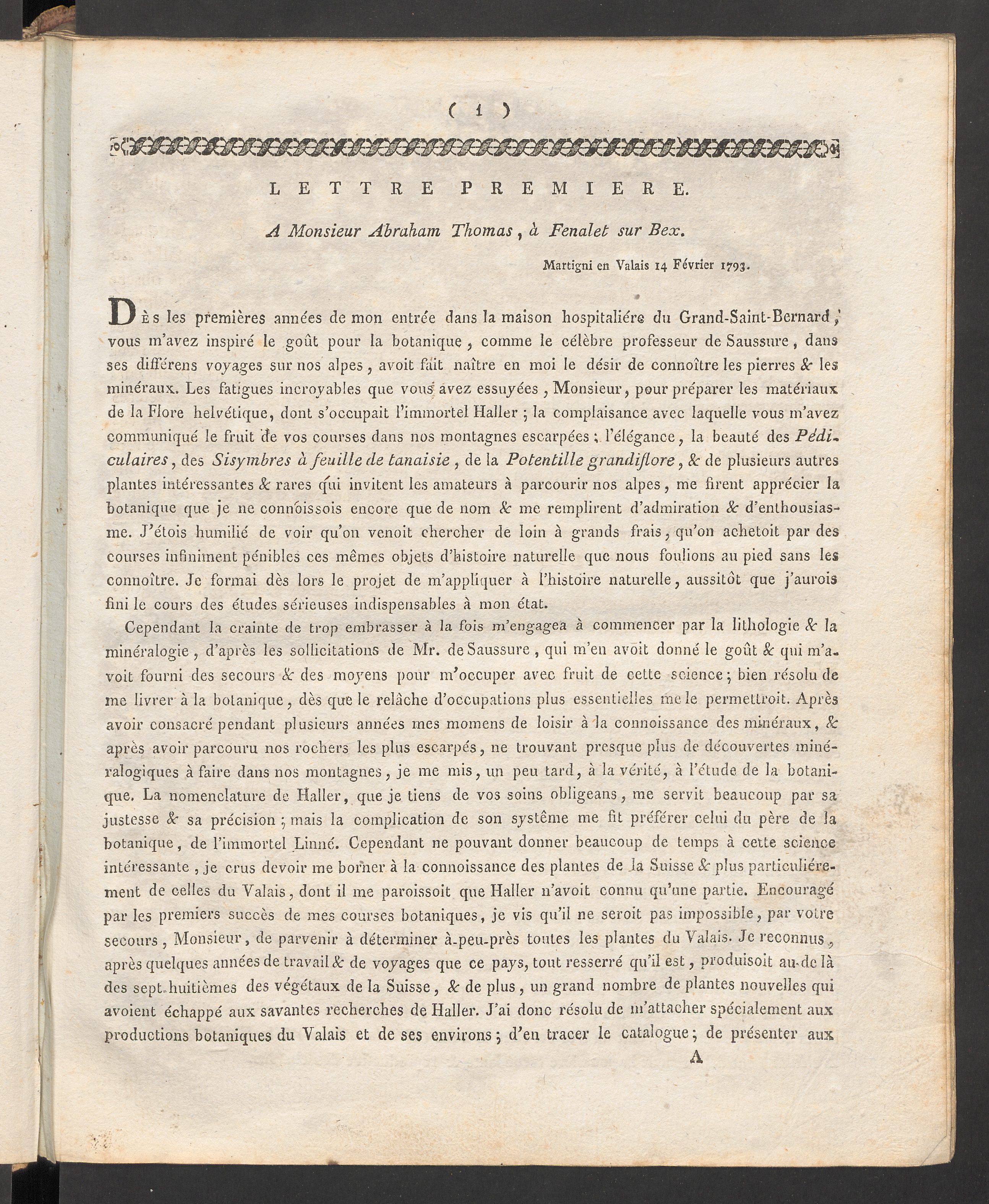 Cependant la crainte de trop embrasser à la fois m’engagea à commencer par la lithologie 8c laminéralogie , d’après les sollicitations de Mr. de Saussure , qui m’en avoit donné le goût k qui m’a-voit fourni des secours 8c des moyens pour m’occuper avec fruit de cette science; bien résolu deme livrera la botanique, dès que le relâche d’occupations plus essentielles me le permettroit. Aprèsavoir consacré pendant plusieurs années rues momens de loisir à la connoissance des minéraux, 8caprès avoir parcouru nos rochers les plus escarpés, 11e trouvant presque plus de découvertes miné-ralogiques à faire dans nos montagnes, je me mis, un peu tard, à la vérité, à l’étude de la botani-que. La nomenclature de Haller, que je tiens de vos soins obligeans, me servit beaucoup par sajustesse 8c sa précision ; mais la complication de son système me fit préférer celui du père de labotanique, de l’immortel Linné . Cependant ne pouvant donner beaucoup de temps à cette scienceintéressante , je crus devoir me borner à la connoissance des plantes de .la Suisse 8c plus particulière-ment de celles du Valais , dont il me paroissoit que Haller n’avoit connu qu’une partie. Encouragépar les premiers succès de mes courses botaniques, je vis qu’il ne seroit pas impossible, par votresecours, Monsieur, de parvenir à déterminer à.peu.près toutes les plantes du Valais . Je reconnus,,après quelques années de travail 8c de voyages que ce pays, tout resserré qu’il est, produisoit au-dc làdes sept, huitièmes des végétaux de la Suisse , 8c de plus , un grand nombre de plantes nouvelles quiavoient échappé aux savantes recherches de Haller. J’ai donc résolu de m’attacher spécialement auxproductions botaniques du Valais et de ses environs; d’en tracer le catalogue; de présenter aux