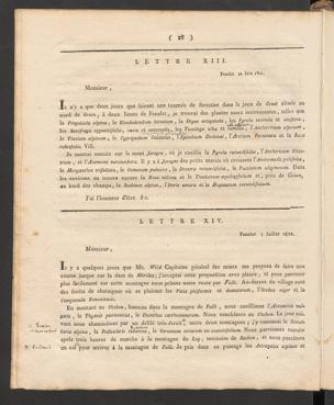Il y a quelques jours que Mr. Wild Capitaine général des mines me proposa de faire unecourse jusque sur la dent de Mbrclaz ; j’acceptai cette proposition avec plaisir , et pour parvenirplus facilement sur cette montagne nous prîmes notre route par Fulli . Au-dessus du village sontdes forêts de chataigner où se plaisent les Vida pisiformis et dumetorum, Yûrobtis niger et laCampanula Bononiemis.