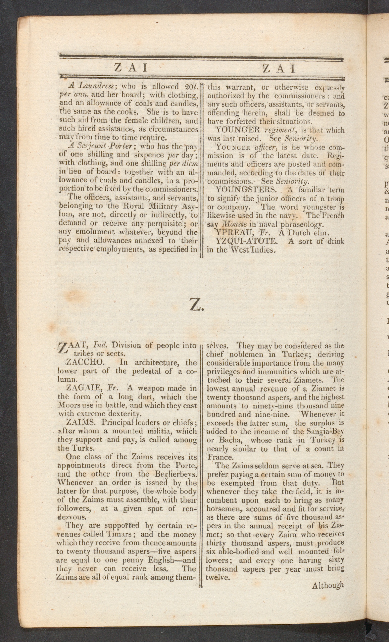 ZAGAIE, TV. A weapon made inthe form of a long dart, which theMoors use in battle, and which they castwith extreme dexterity.