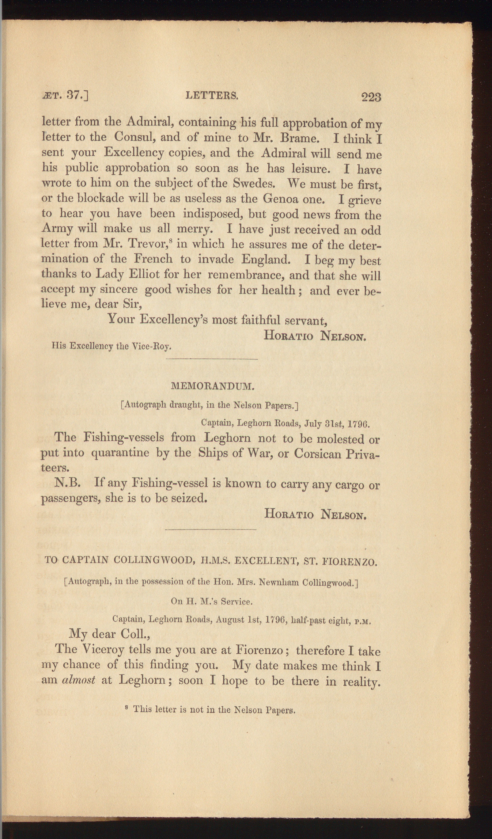 The Viceroy tells me you are at Fiorenzo; therefore I takemy chance of this finding you. My date makes me think Iam almost at Leghorn ; soon I hope to be there in reality.