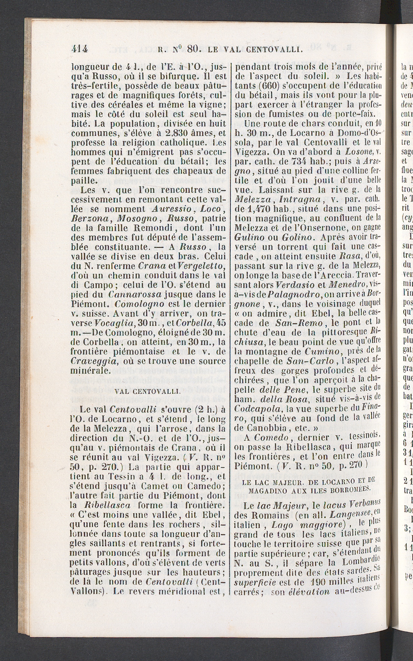 Une route de chars conduit, en 10h. 30 m., de Locarno a Domo-d’Os-sola, par le val Centovalli et levaiVigezza. On va d’abord à Losone , v.par. cath. de 734 hab.; puis à Arst-gno, situé au pied d’une colline fer-tile et d’où l’on jouit d’une bellevue. Laissant sur la rive g. de laMelezza, Intragna , v. par. cath.de 1,470 hab., situé dans une posi-tion magnifique, au confluent de laMelezza et de l’Onsernone , on gagneGulino ou Golino. Après avoir tra-versé un torrent qui fait une cas-cade , on atteint ensuite Rasa, d’où,passant sur la rive g. de la Melezza,on longe la base de l’Areccia. Traver-sant alors Verdasio et MenedroA'K-a-visde Palagnodro, on arriveà Bor-gnone , v., dans le voisinage duquel« on admire, dit Ebel, la belle cas-cade de San-Remo , le pont et lachute d’eau de la pittoresque Bi-chiusa, le beau point de vue qu’offrela montagne de Cumino, près delàchapelle de San-Carlo , l’aspect af-freux des gorges profondes cl dé-chirées, que l’on aperçoit à la cha-pelle delle Pene, le superbe site duham. délia Rosa, situé vis-à-vis deCodcapola, la vue superbe duf'wj"ro, qui s’élève au fond de la valleede Canobbia , etc. »