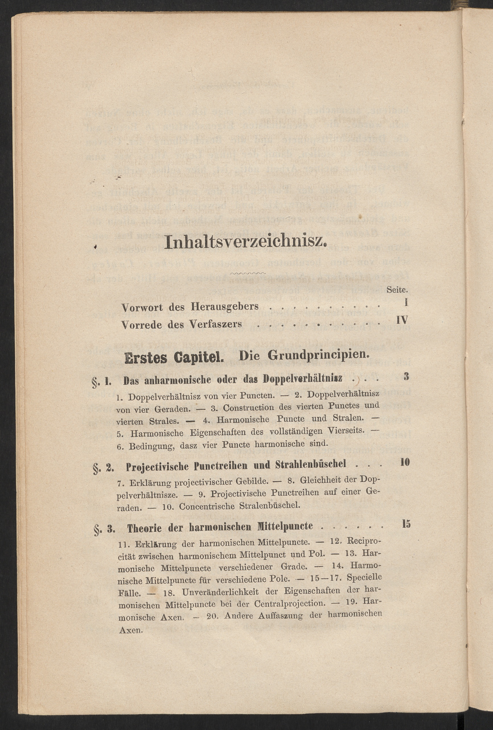 I. Doppel verhältnisz von vier Puncten. — 2. Doppelverhältniszvon vier Geraden. — 3. Construetion des vierten Punetes undvierten Strales. — 4. Harmonische Puncte und Stralen. —