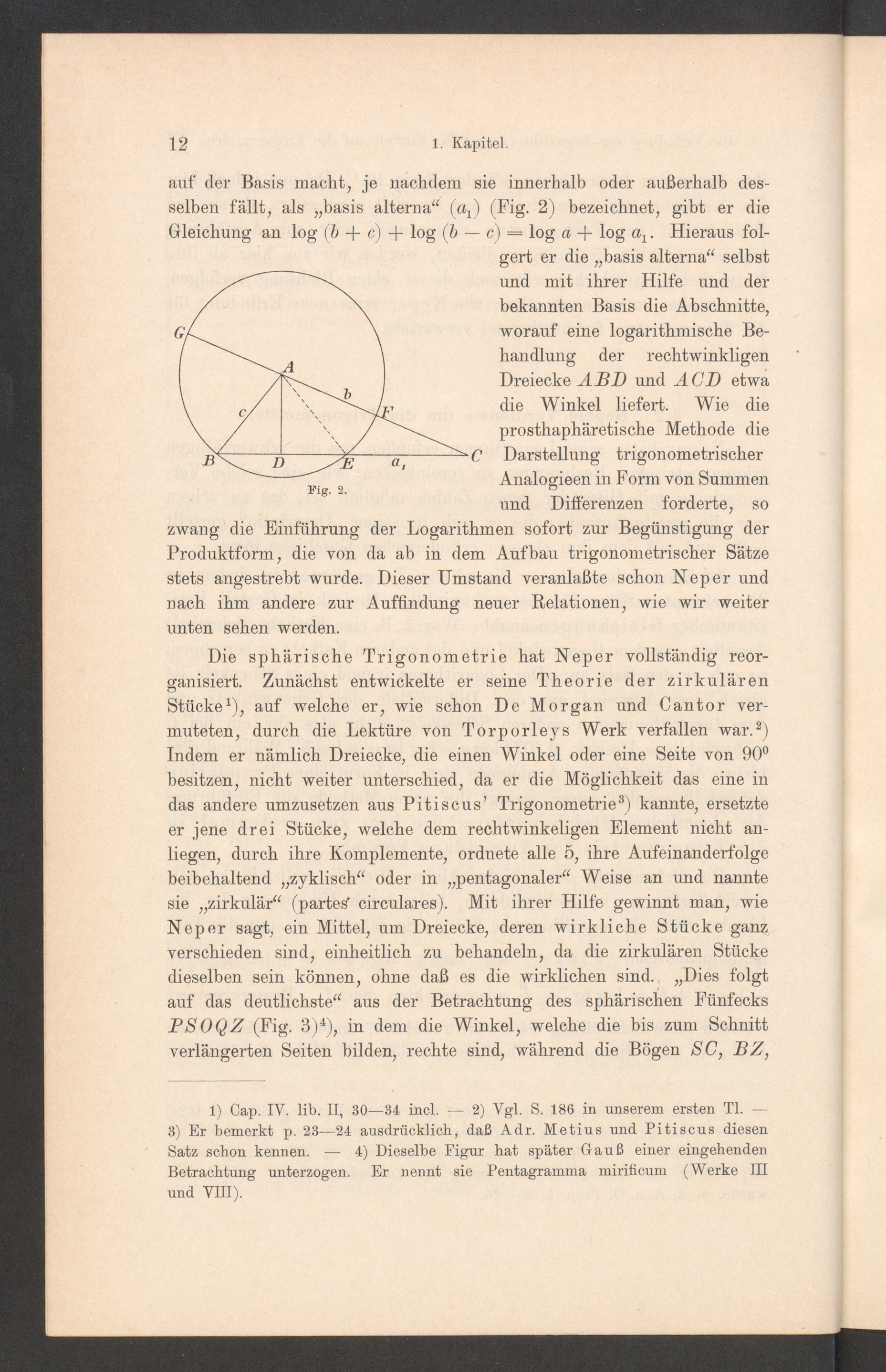 Die sphärische Trigonometrie hat Neper vollständig reor-ganisiert. Zunächst entwickelte er seine Theorie der zirkulärenStücke 1 ), auf welche er, wie schon De Morgan und Cantor ver-muteten, durch die Lektüre von Torporleys Werk verfallen war. 2 3 )Indem er nämlich Dreiecke, die einen Winkel oder eine Seite von 90°besitzen, nicht weiter unterschied, da er die Möglichkeit das eine indas andere umzusetzen aus Pitiscus’ Trigonometrie 8 ) kannte, ersetzteer jene drei Stücke, welche dem recht winkeligen Element nicht an-liegen, durch ihre Komplemente, ordnete alle 5, ihre Aufeinanderfolgebeibehaltend „zyklisch" oder in „pentagonaler" Weise an und nanntesie „zirkulär“ (partes circulares). Mit ihrer Hilfe gewinnt man, wieNeper sagt, ein Mittel, um Dreiecke, deren wirkliche Stücke ganzverschieden sind, einheitlich zu behandeln, da die zirkulären Stückedieselben sein können, ohne daß es die wirklichen sind. „Dies folgtauf das deutlichste" aus der Betrachtung des sphärischen FünfecksPSOQZ (Fig. 3) 4 * * ), in dem die Winkel, welche die bis zum Schnittverlängerten Seiten bilden, rechte sind, während die Bögen SC, BZ,