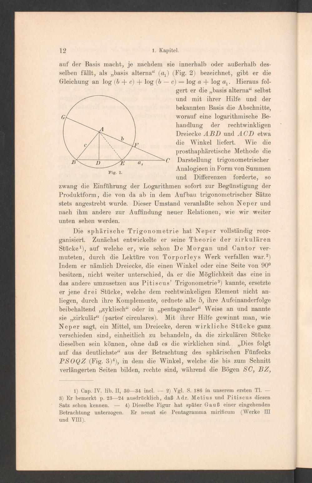 auf der Basis macht, je nachdem sie innerhalb oder außerhalb des-selben fällt, als „basis alterna" («.,) (Fig. 2) bezeichnet, gibt er dieGleichung an log (b -f c) + log (b — c ) = log a + log . Hieraus fol-gert er die „basis alterna" selbstund mit ihrer Hilfe und derbekannten Basis die Abschnitte,worauf eine logarithmische Be-handlung der rechtwinkligenDreiecke ABD und ACB etwadie Winkel liefert. Wie dieprosthaphäretische Methode dieC Darstellung trigonometrischerAnalogieen in Form von Summenund Differenzen forderte, sozwang die Einführung der Logarithmen sofort zur Begünstigung derProduktform, die von da ab in dem Aufbau trigonometrischer Sätzestets angestrebt wurde. Dieser Umstand veranlaßte schon Neper undnach ihm andere zur Auffindung neuer Relationen, wie wir weiterunten sehen werden.