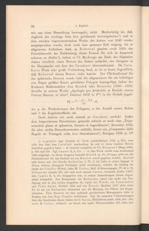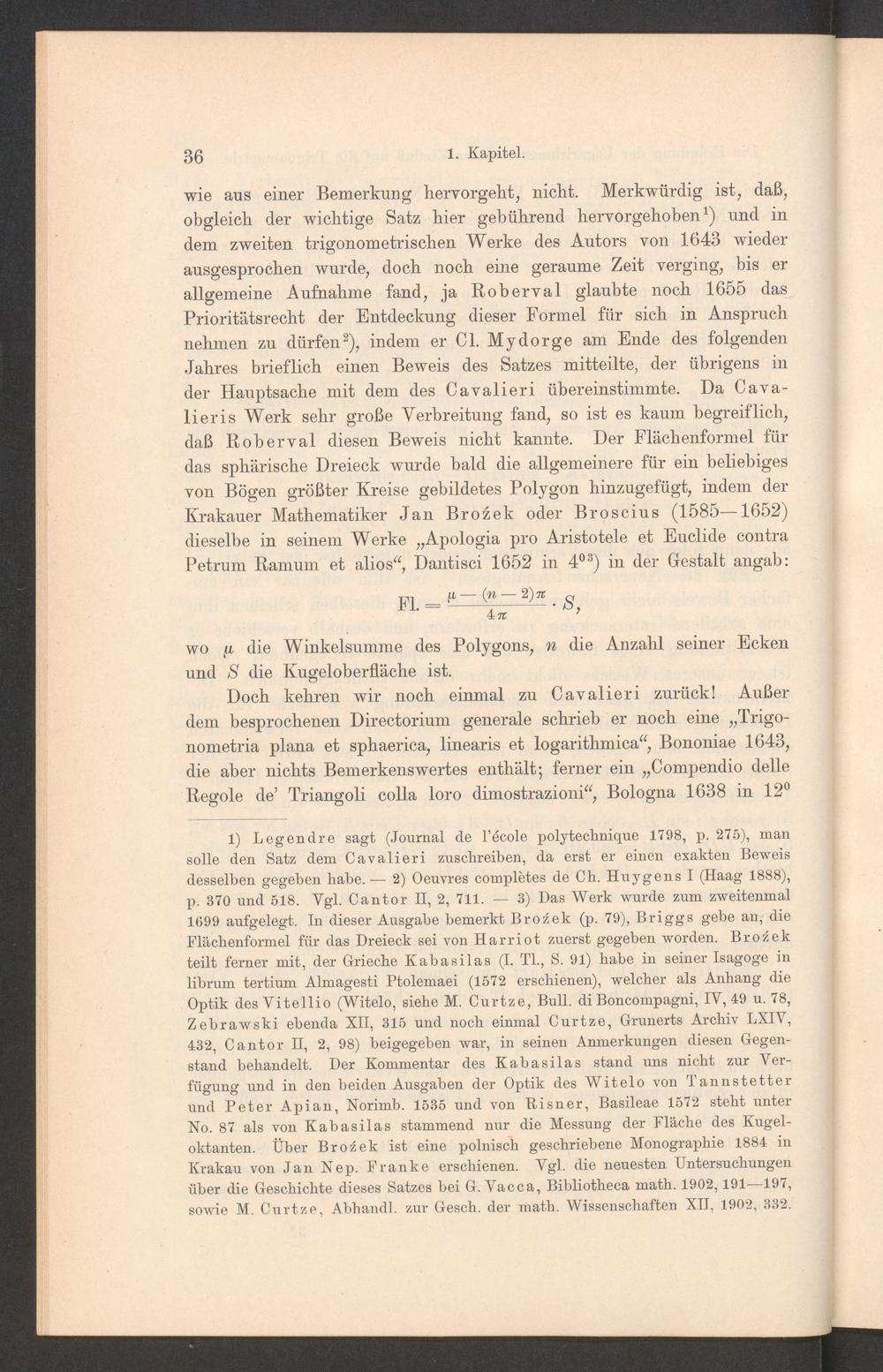 desselben gegeben habe. — 2) Oeuvres completes de Ch. Huygens I (Haag 1888),p. 370 und 518. Vgl. Cantor II, 2, 711. — 3) Das Werk wurde zum zweitenmal1699 aufgelegt. In dieser Ausgabe bemerkt Brozek (p. 79), Briggs gebe an, dieFlächenformel für das Dreieck sei von Harriot zuerst gegeben worden. Brozekteilt ferner mit, der Grieche Kabasilas (I. Th, S. 91) habe in seiner Isagoge inlibrum tertium Almagesti Ptolemaei (1572 erschienen), welcher als Anhang dieOptik desVitellio (Witelo, siehe M. Curtze, Bull, di Boncompagni, IV, 49 u. 78,Zebrawski ebenda XII, 315 und noch einmal Curtze, Grunerts Archiv LXIV,432, Cantor II, 2, 98) beigegeben war, in seinen Anmerkungen diesen Gegen-stand behandelt. Der Kommentar des Kabasilas stand uns nicht zur Ver-fügung und in den beiden Ausgaben der Optik des Witelo von Tannstetterund Peter Apian, Norimb. 1535 und von Risner, Basileae 1572 steht unterNo. 87 als von Kabasilas stammend nur die Messung der Fläche des Kugel-oktanten. Über Brozek ist eine polnisch geschriebene Monographie 1884 inKrakau von Jan Nep. Franke erschienen. Vgl. die neuesten Untersuchungenüber die Geschichte dieses Satzes bei G. Vacca, Bibliotheca math. 1902,191—197,sowie M. Curtze, Abliandl. zur Gesch. der math. Wissenschaften XII, 1902, 332.
