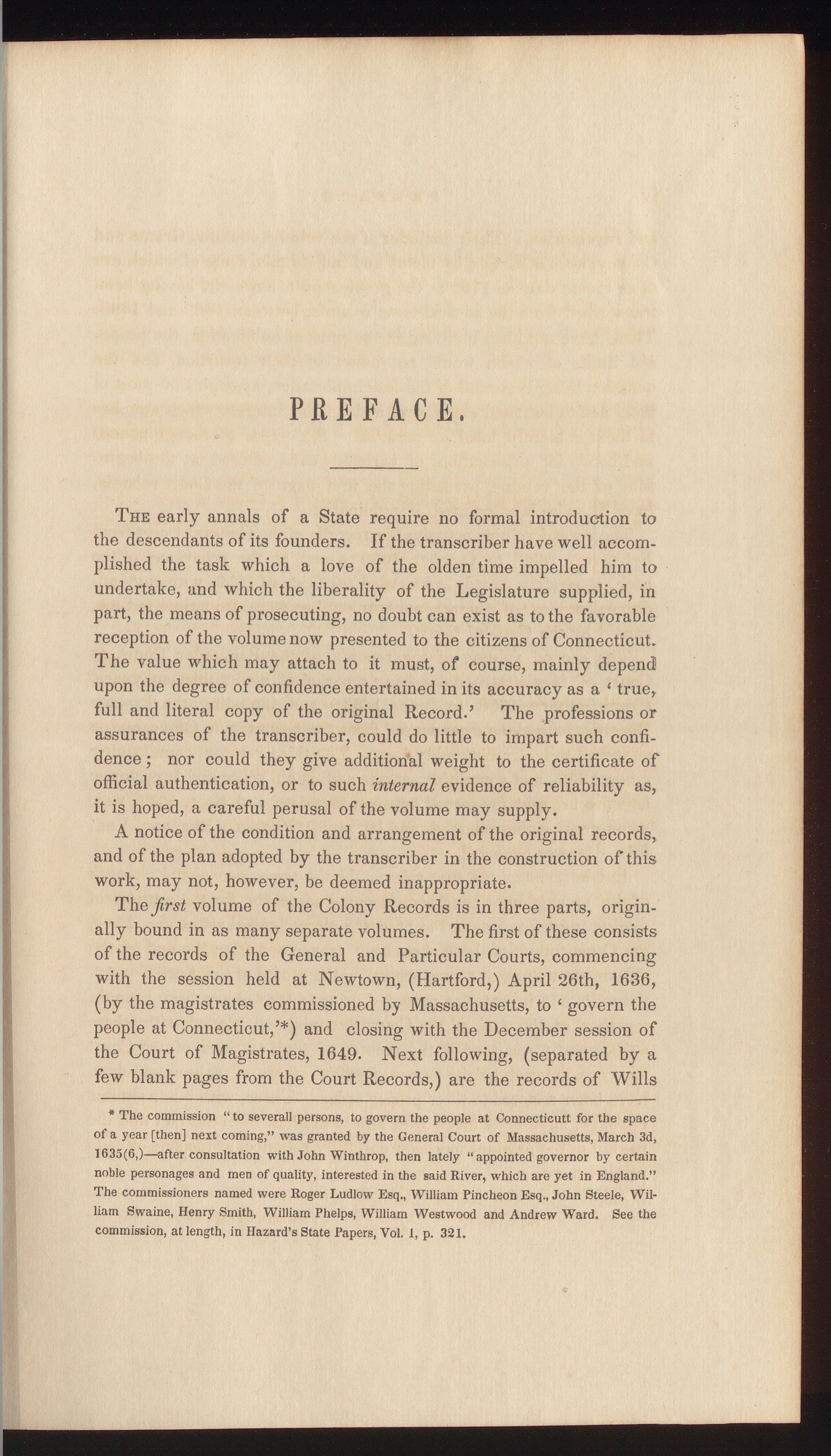 The first volume of the Colony Records is in three parts, origin-ally bound in as many separate volumes. The first of these consistsof the records of the General and Particular Courts, commencingwith the session held at Newtown, (Hartford, ) April 26th, 1636,(by the magistrates commissioned by Massachusetts , to ‘ govern thepeople at Connecticut, ’*) and closing with the December session ofthe Court of Magistrates, 1649. Next following, (separated by afew blank pages from the Court Records,) are the records of Wills