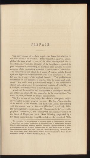 The early annals of a State require no formal introduction tothe descendants of its founders. If the transcriber have well accom-plished the task which a love of the olden time impelled him toundertake, and which the liberality of the Legislature supplied, inpart, the means of prosecuting, no doubt can exist as to the favorablereception of the volume now presented to the citizens of Connecticut .The value which may attach to it must, of course, mainly dependupon the degree of confidence entertained in its accuracy as a ‘ true,full and literal copy of the original Record.’ The professions orassurances of the transcriber, could do little to impart such confi-dence ; nor could they give additional weight to the certificate ofofficial authentication, or to such internal evidence of reliability as,it is hoped, a careful perusal of the volume may supply.