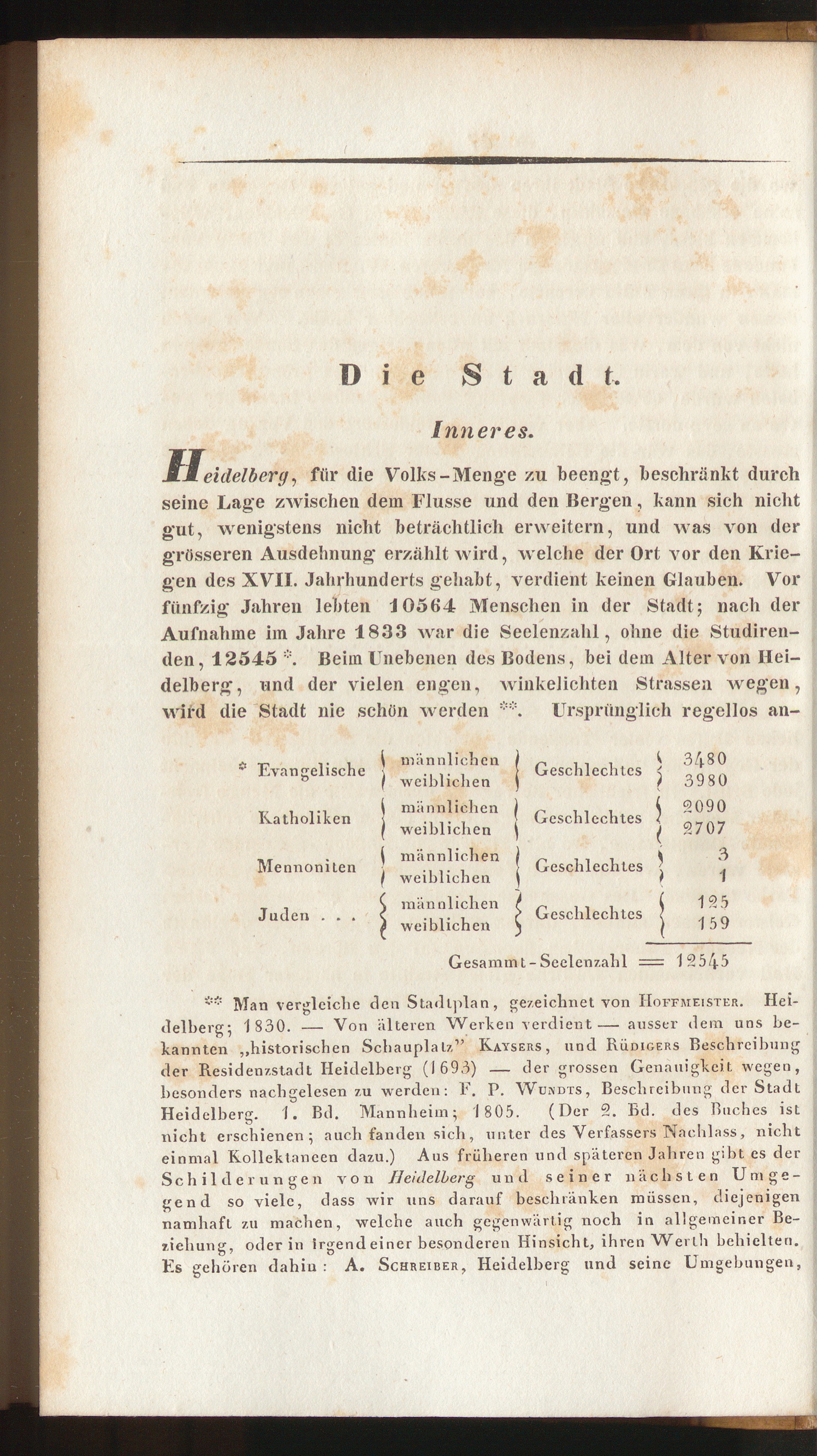 MM eiilelbcry , für die Volks-Menge zu beengt, beschränkt durchseine Lage zwischen dein Flusse und den Bergen, kann sich nichtgut, wenigstens nicht beträchtlich erweitern, und was von dergrösseren Ausdehnung erzählt wird, welche der Ort vor den Krie-gen des XVII. Jahrhunderts gehabt, verdient keinen Glauben. Vorfünfzig Jahren lebten 10564 Menschen in der Stadt; nach derAufnahme im Jahre 1833 war die Seelenzahl, ohne die Studiren-den, 12545 *. Beim Unebenen des Bodens, bei dem Alter von Hei-delberg, und der vielen engen, winkelichten Strassen wegen,wird die Stadt nie schön werden **. Ursprünglich regellos an-