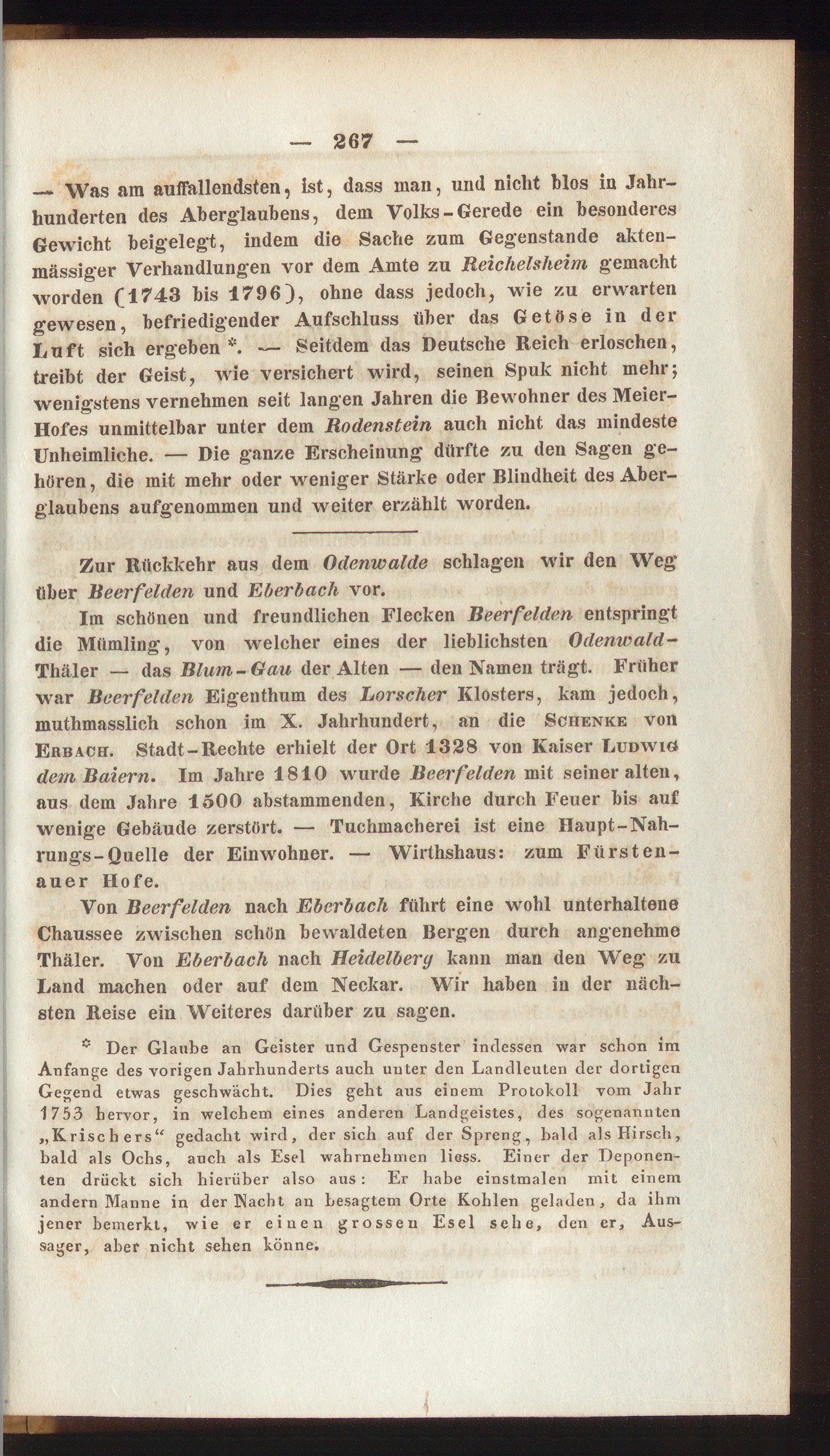 Von Beerfelden nach Eberbach führt eine wohl unterhalteneChaussee zwischen schön bewaldeten Bergen durch angenehmeThäler. Von Eberbach nach Heidelberg kann man den Weg zuLand machen oder auf dem Neckar. Wir haben in der näch-sten Reise ein Weiteres darüber zu sagen.