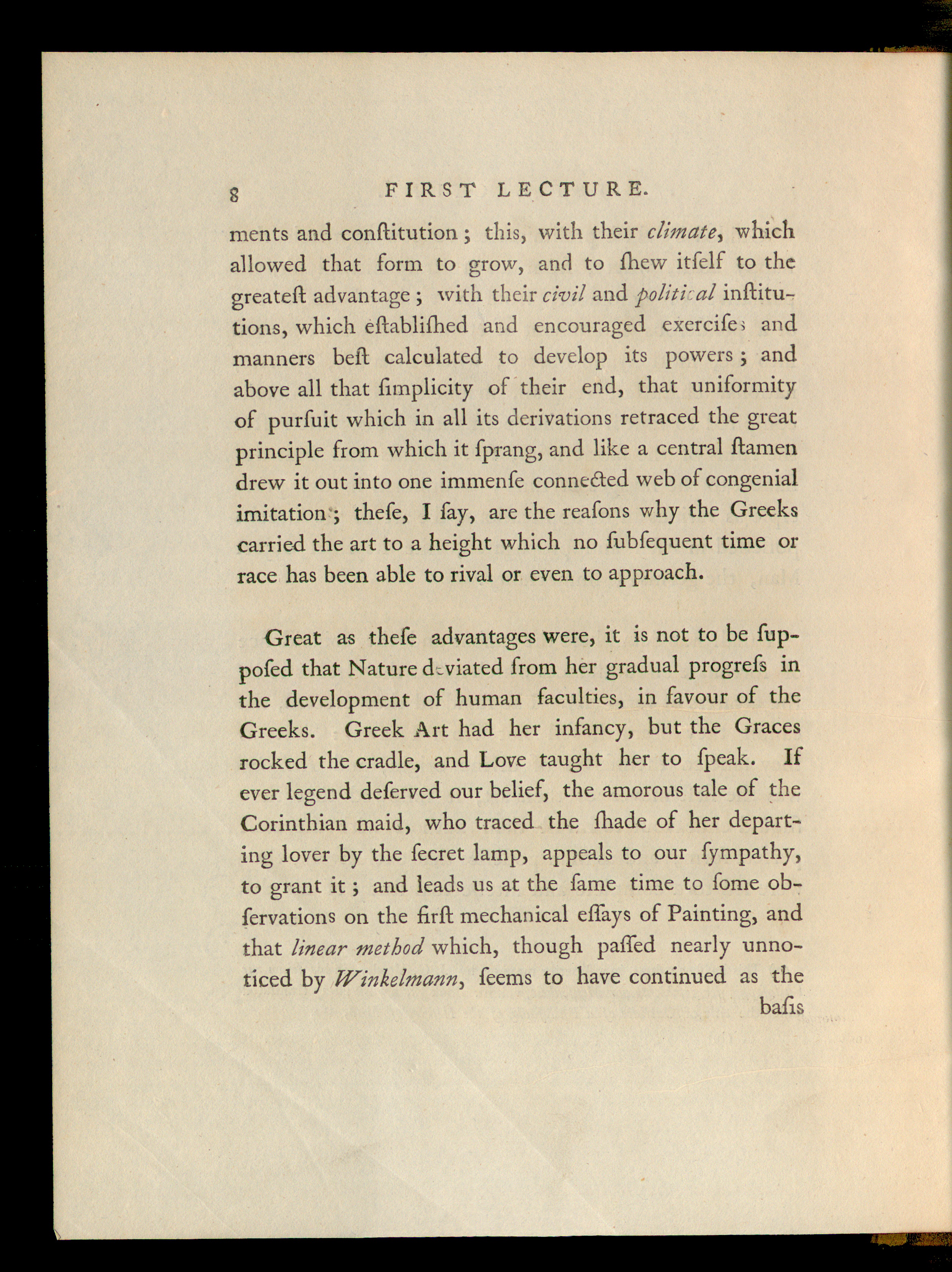 Great as thefe advantages were, it is not to be fup-pofed that Nature deviated from her gradual progrefs inthe development of human faculties, in favour of theGreeks. Greek Art had her infancy, but the Gracesrocked the cradle, and Love taught her to fpeak. Ifever legend deferved our belief, the amorous tale of theCorinthian maid, who traced the fhade of her depart-ing lover by the fecret lamp, appeals to our fympathy,to grant it; and leads us at the fame time to fome ob-fervations on the firft mechanical elfays of Painting , andthat linear method which, though palled nearly unno-ticed by Winkelmann> feems to have continued as the