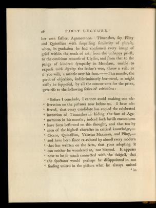 * Before I conclude, I cannot avoid making one ob-‘ fervation on the pictures now before us. I have ob-‘ ferved, that every candidate has copied the celebrated‘ invention of Timanthes in hiding the face of Aga-4 memnon in his mantle; indeed fuch lavifh encomiums4 have been bellowed on this thought, and that too by1 men of the higheft chara&er in critical knowledge,—1 Cicero , Quintilian , Valerius Maximus , and Pliny, —>