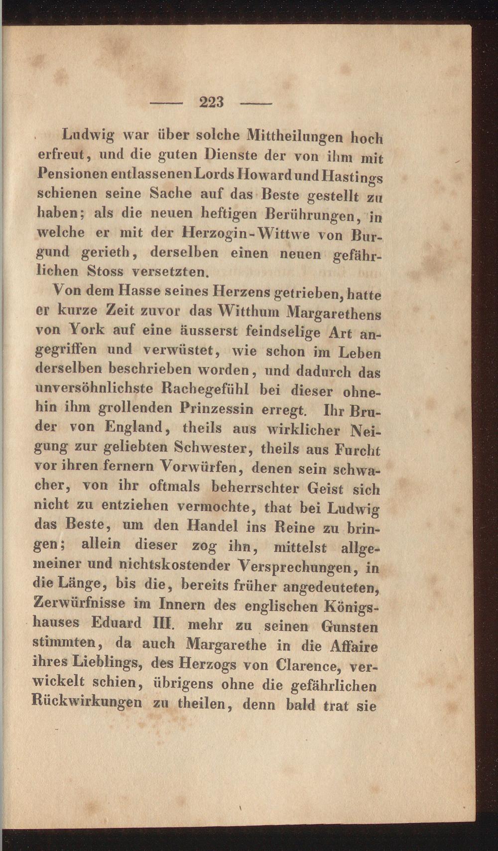 Von dem Hasse seines Herzens getrieben, hatteer kurze Zeit zuvor das Witthum Margarethensvon York auf eine äusserst feindselige Art an-gegriffen und verwüstet, wie schon im Lebenderselben beschrieben worden, und dadurch dasunversöhnlichste Rachegefühl bei dieser ohne-hin ihm grollenden Prinzessin erregt. Ihr Bru-der von England, theils aus wirklicher Nei-gung zur geliebten Schwester, theils aus Furchtvor ihren fernem Vorwürfen, denen sein schwa-cher, von ihr oftmals beherrschter Geist sichnicht zu entziehen vermochte, that bei Ludwigdas Beste, um den Handel ins Reine zu brin-gen; allein dieser zog ihn, mittelst allge-meiner und nichtskostender Versprechungen, indie Länge, bis die, bereits früher angedeuteten,Zerwürfnisse im Innern des englischen Königs-hauses Eduard III. mehr zu seinen Gunstenstimmten, da auch Margarethe in die Affaireihres Lieblings, des Herzogs von Clarence, ver-wickelt schien, übrigens ohne die gefährlichenRückwirkungen zu theilen, denn bald trat sie