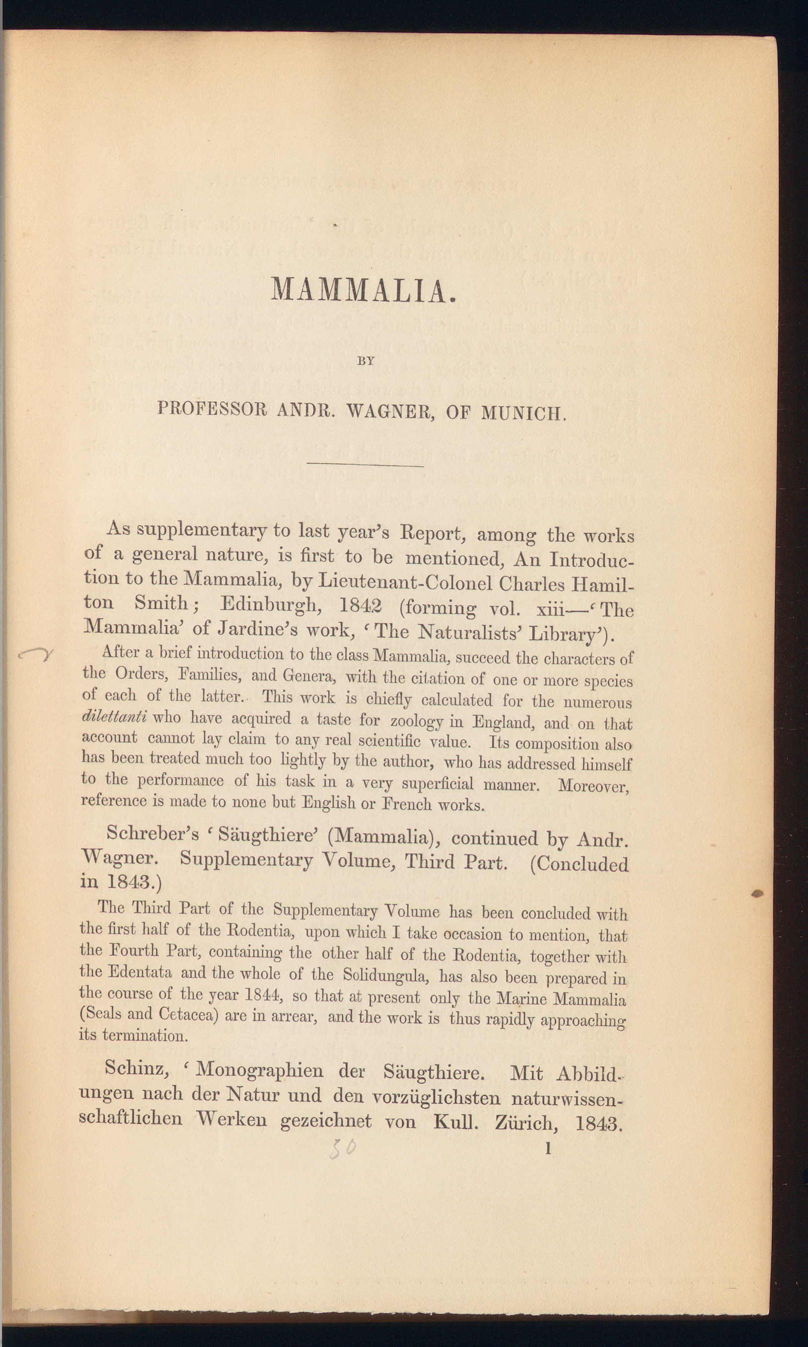 As supplementary to last year’s Report, among the worksof a general nature, is first to be mentioned, An Introduc-tion to the Mammalia , by Lieutenant-Colonel Charles Hamil ton Smith ; Edinburgh , 1842 (forming vol. xiii—‘The Mammalia ’ of Jardine’s work, f The Naturalists’ Library’).