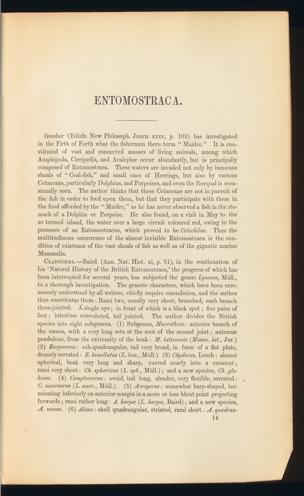 Goodsir (Edinb. New Philosoph . Journ. xxxv, p. 102) has investigatedin the Eirth of Forth what the fishermen there term “ Maidre.” It is con-stituted of vast and connected masses of living animals, among whichAmphipoda, Cirripedia, and Acalephse occur abundantly, but is principallycomposed of Entomostraca. These waters are invaded not only by immenseshoals of “ Coal-fish,” and small ones of Herrings, but also by variousCetaceans, particularly Dolphins, and Porpoises , and even the Rorqual is occa-sionally seen. The author thinks that these Cetaceans are not in pursuit ofthe fish in order to feed upon them, but that they participate with them inthe food afforded by the “ Maidre,” as he has never observed a fish in the sto-mach of a Dolphin or Porpoise. He also found, on a visit in May to theso termed island, the water over a large circuit coloured red, owing to thepresence of an Entomostracon, which proved to be Cetochilus. Thus themultitudinous occurrence of the almost invisible Entomostraca is the con-dition of existence of the vast shoals of fish as well as of the gigantic marineMammalia .