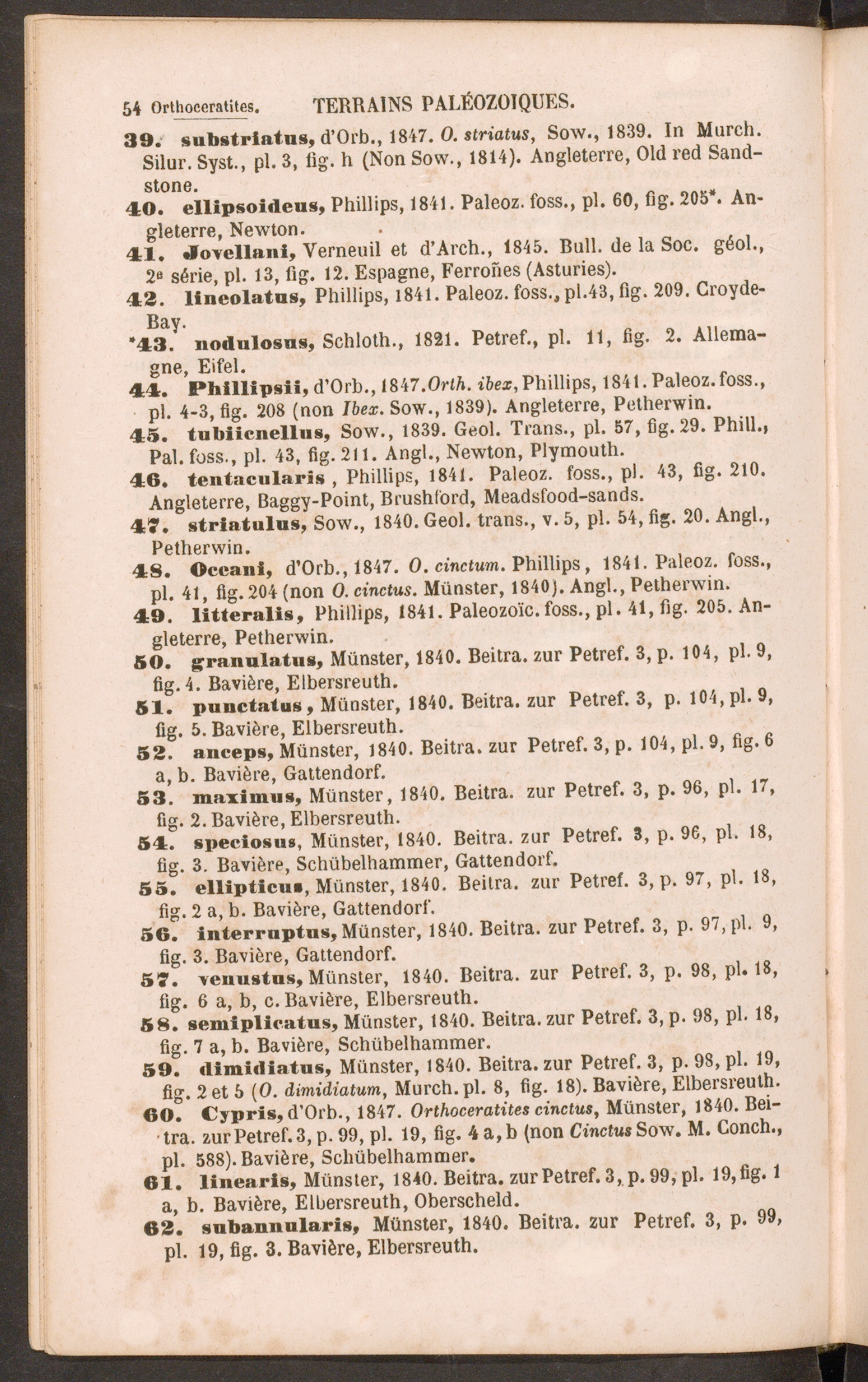 44. Phtllipsii, d’Orb., 1847.OriA.i6e*, Phillips, 1841. Paleoz.foss.,pl. 4-3, fig. 208 (non /6e*. Sow., 1839). Angleterre, Petherwin.