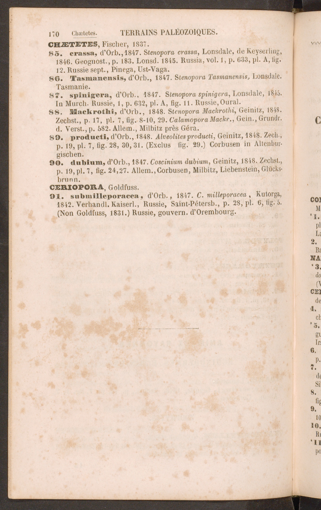 85. crassa, d’Orb.,1847. St enopora crassa, Lonsdale, de Keyserling,1846. Geognost.,p. 183. Lonsd. 1845. Russie, vol. 1, p. 633, pl. A, lig.12. Russie sept., Pinega, Ust-Vaga.