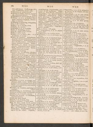 - ‘v. n to draw off, remove.Weg/.ug, drawing away, etc •Weh, or Wehe, i. wo, woe. - mir !■wo me -ad. -thun, toake; fig*