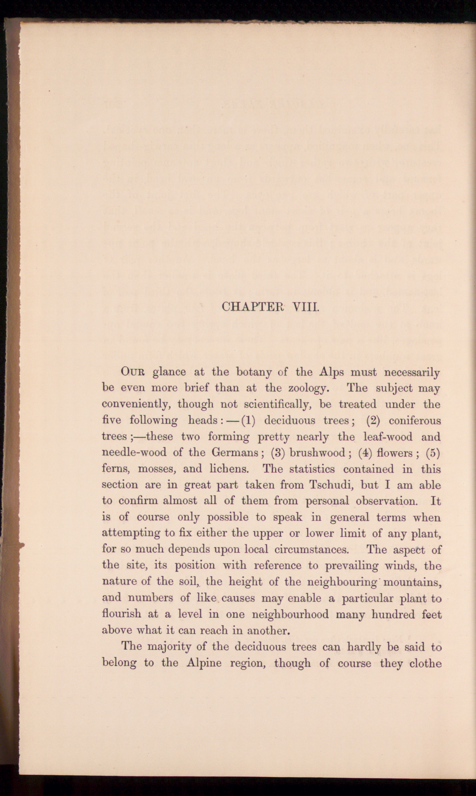 Our glance at the botany of the Alps must necessarilybe even more brief than at the zoology. The subject mayconveniently, though not scientifically, be treated under thefive following heads:—(1) deciduous trees; (2) coniferoustrees;—these two forming pretty nearly the leaf-wood andneedle-wood of the Germans ; (3) brushwood; (4) flowers ; (5)ferns, mosses, and lichens. The statistics contained in thissection are in great part taken from Tschudi, but I am ableto confirm almost all of them from personal observation. Itis of course only possible to speak in general terms whenattempting to fix either the upper or lower limit of any plant,for so much depends upon local circumstances. The aspect ofthe site, its position with reference to prevailing winds, thenature of the soil, the height of the neighbouring'mountains,and numbers of like causes may enable a particular plant toflourish at a level in one neighbourhood many hundred feetabove what it can reach in another.