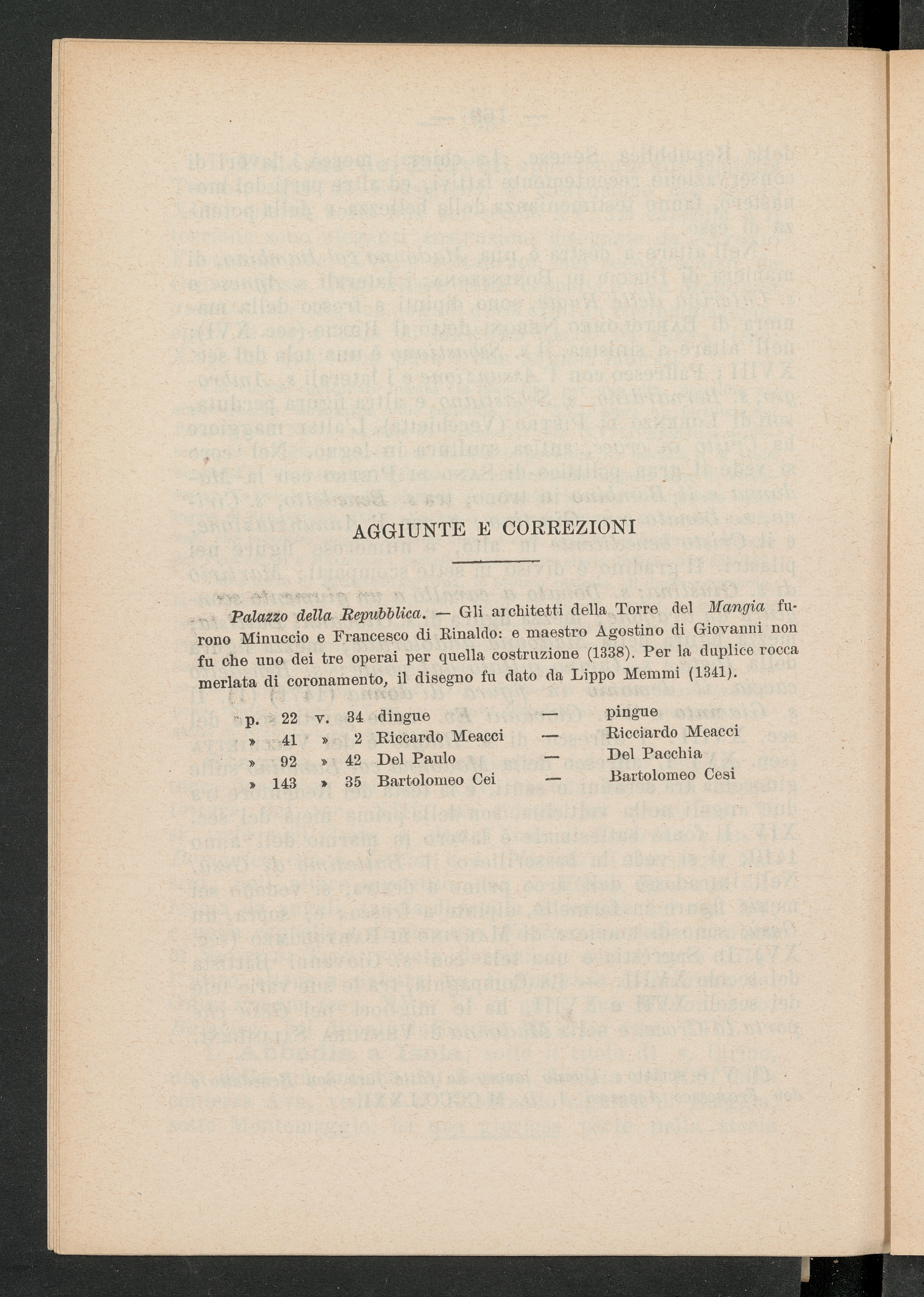 Palazzo della Repubblica. — Gli architetti della Torre del Mangia fu-rono Minuccio e Francesco di Rinaldo: e maestro Agostino di Giovanni nonfu che uno dei tre operai per quella costruzione (1338). Per la duplice roccamerlata di coronamento, il disegno fu dato da Lippo Memmi (1341).