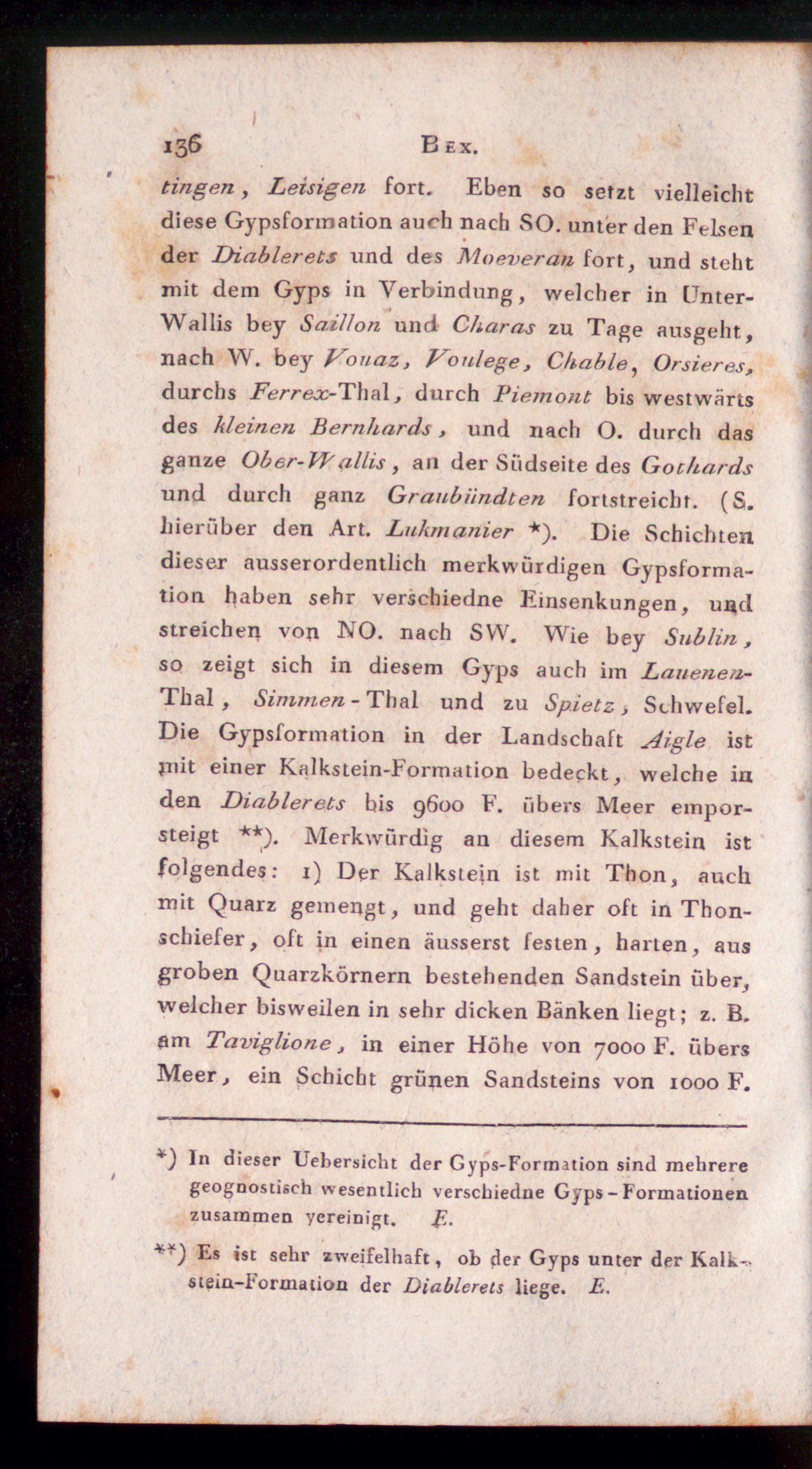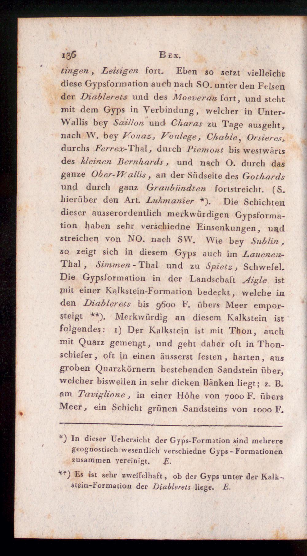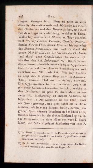 tingen, Leisigen fort. Eben so setzt vielleichtdiese Gypsformation auch nach SO. unter den Felsender Diablerets und des Moeveran fort, und stehtmit dem Gyps in Verbindung, welcher in Unter-Wallis bey Saillon und Charas zu Tage ausgeht,nach W. bey Vouaz, Vonlege , Chahle , Orsieres ,durchs Ferreoc- Thal, durch Piemont bis westwärtsdes kleinen Bernhards, und nach 0 . durch dasganze Ober-VPallis , an der Südseite des Gothardsund durch ganz Graubiindten fortstreicht. (S.hierüber den Art. Lukmanier *). Die Schichtendieser ausserordentlich merkwürdigen Gypsforma-tion haben sehr verschiedne Einsenkungen, undstreichen von NO. nach SW. Wie bey Sublin,so zeigt sich in diesem Gyps auch im Lauenea-Thal , Simmen - Thal und zu Sp.ietz , Schwefel.Die Gypsformation in der Landschaft Aigle istjnit einer Kalkstein-Formation bedeckt, welche inden Diablerets bis 9600 F. übers Meer empor-steigt **). Merkwürdig an diesem Kalkstein istfolgendes: 1) Der Kalkstein ist mit Thon, auchmit Quarz gemengt, und geht daher oft in Thon-schiefer, oft in einen äusserst festen, harten, ausgroben Quarzkörnern bestehenden Sandstein über,welcher bisweilen in sehr dicken Bänken liegt; z. B.flm Taviglione, in einer Höhe von 7000 F. übersMeer, ein Schicht grünen Sandsteins von 1000 F.