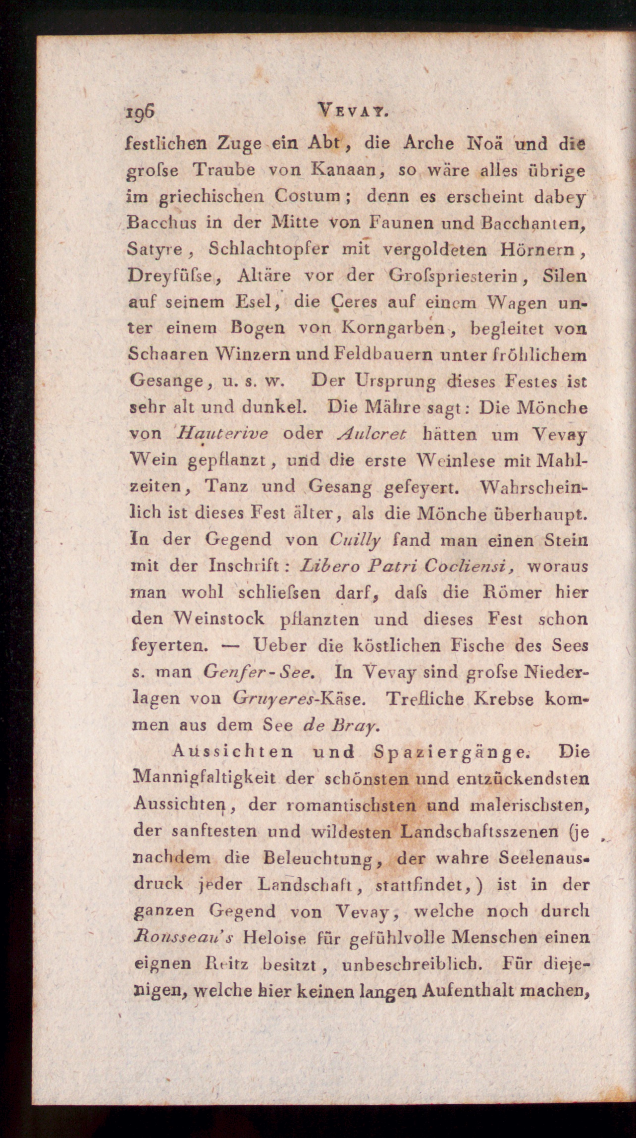 festlichen Zuge ein Abt, die Arche Noä und diegrofse Traube von Kanaan, so wäre alles übrigeim griechischen Costum ; denn es erscheint dabeyBacchus in der Mitte von Faunen und Bacchanten,Satyre , Schlachtopfer mit vergoldeten Hörnern,Dreyfüfse, Altäre vor der Grofspriesterin, Silenauf seinem Esel, die feres auf einem Wagen un-ter einein Bogen von Korngarben, begleitet vonSchaaren Winzern und Feldbauern unter fröhlichemGesänge, u. s. w. Der Ursprung dieses Festes istsehr alt und dunkel. Die Mähre sagt: Die Mönchevon Hauterive oder Aulcret hätten um VevayWein gepflanzt, und die erste Weinlese mit Mahl-zeiten, Tanz und Gesang gefeyert. Wahrschein-lich ist dieses Fest älter, als die Mönche überhaupt.In der Gegend von Cuilly fand man einen Steinmit der Inschrift: Libero Patri Cocliensi, worausman wohl schliefsen darf, dafs die Römer hierden Weinstock pflanzten und dieses Fest schonfeyerten. — Ueber die köstlichen Fische des Seess. man Genfer - See. In Vevay sind grofse Nieder-lagen von Gruyeres - Käse. Trefliche Krebse kom-men aus dem See de Bray .