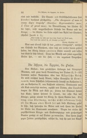 Von Ktesias, dem griechischen Leibarzte des ArtaxerxesMnemon, und zwar durch Vermittlung des Diodor (2, 1—22)stammen unsere Nachrichten über das Assyrische Reich.Es wird errichtet durch Ninos; dessen Gemahlin ist Semi-ramis, deren Schicksale seltsamerweise sowohl an Katharina I.,als an Katharina II. von Rußland erinnern; Semiramis warals Kind ausgesetzt worden, erzählt uns Diodor, aber Taubentrugen ihr Milch und Käse zu; Hirten des Simmas findendas Kind; später heiratet sie Onnes, der erste Rat desKönigs; zuletzt nimmt der König sie ihrem Gatten fort. Sietrug eine Kleidung, welche nicht erkennen ließ,ob sie Mann oder Weib sei und diese Kleidung gefielso sehr, daß späterhin die Meder und nach ihnen die Perserdie Stola der Semiramis annahmen. Wegen der vielen ihrzugeschriebenen Kriegs- und Eroberungszüge und großartigenBauten genügt es auf Diodor zu verweisen. Von ihrem Zugegegen Indien zurückgekehrt, erfährt sie, daß ihr und des Ninos