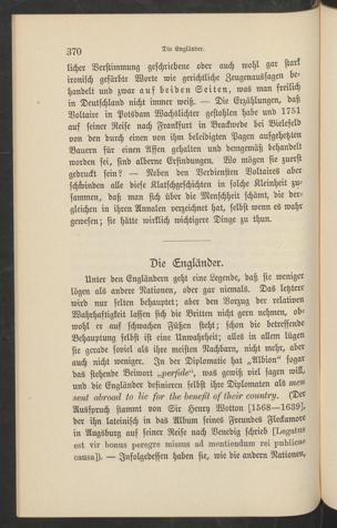 Unter den Engländern geht eine Legende, daß sie wenigerlögen als andere Nationen, oder gar niemals. Das letzterewird nur selten behauptet; aber den Vorzug der relativenWahrhaftigkeit lassen sich die Britten nicht gern nehmen, ob-wohl er auf schwachen Füßen steht; schon die betreffendeBehauptung selbst ist eine Unwahrheit; alles in allem lügensie gerade soviel als ihre meisten Nachbarn, nicht mehr, aberauch nicht weniger. In der Diplomatie hat „Albion" sogardas stehende Beiwort was gewiß viel sagen will,