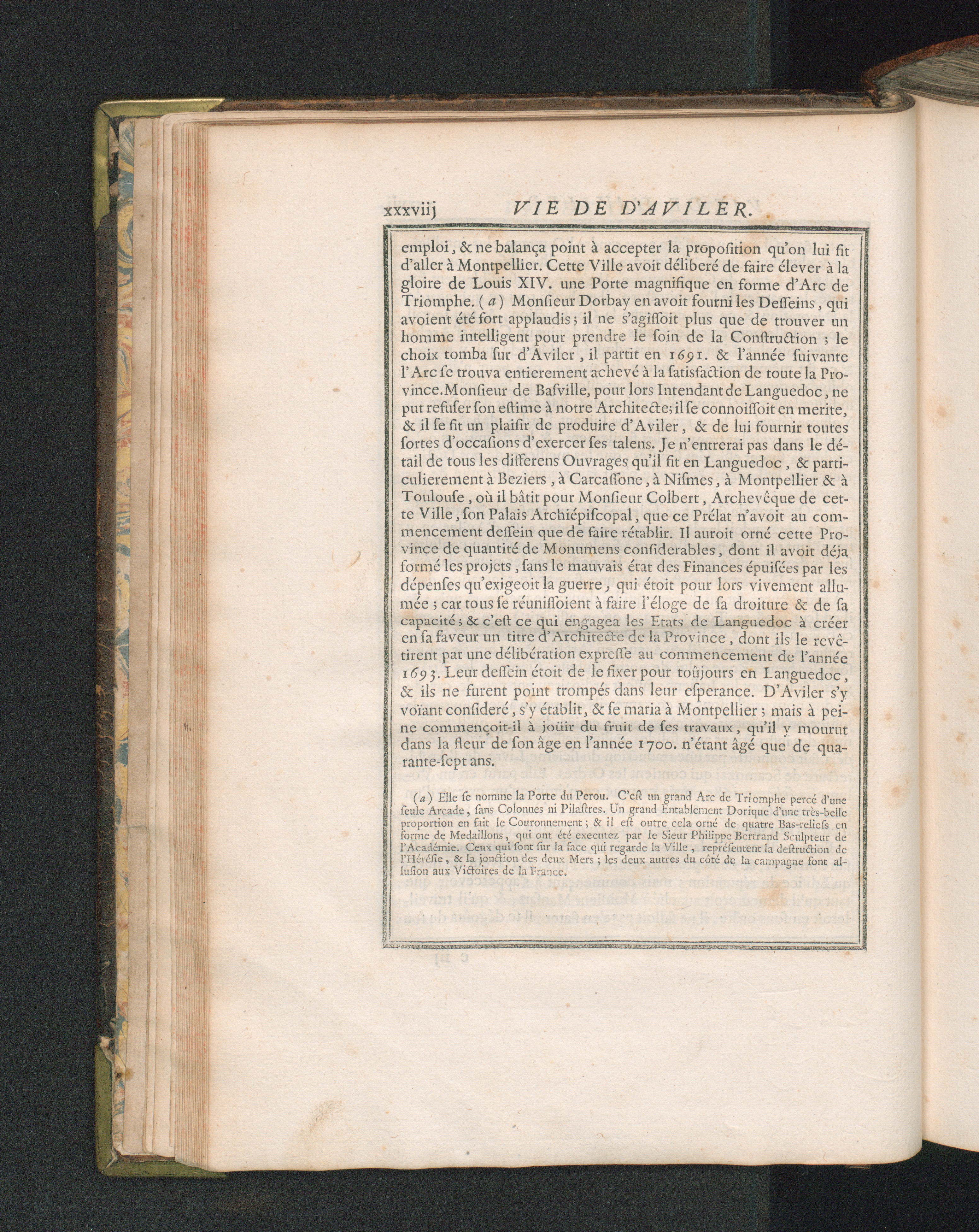 emploi, & ne balança point à accepter la proposition qu’on lui fitd’aller à Montpellier. Cette Ville avoir délibéré de faire élever à lagloire de Louis XIV. une Porte magnifique en forme d’Arc deTriomphe. ( a ) Monsieur Dorbay en avoir fourni les Desseins, quiavoient été fort applaudis ; il ne s’agissoit plus que de trouver unhomme intelligent pour prendre le foin de la Construction ; lechoix tomba fur d’Aviler, il partit en 1691. & l’année suivanteT Arc se trouva entierement achevé à la satisfaction de toute la Pro-vince.Monsieur de Basville, pour lors Intendant de Languedoc, neput refuser son estime à notre Architecte; il se connoissoit en mérité,& il se fit un plaisir de produire d’Aviler, & de lui fournir toutessortes d’occasions d’exercer ses talens. Je n’entrerai pas dans le dé-tail de tous les disserens Ouvrages qu il fit en Languedoc , & parti-culièrement à Beziers , à Carcassone, à Nismes, à Montpellier & àToulouse, où il bâtit pour Monsieur Colbert, Archevêque de cet-te Ville, son Palais Archiépiscopal, que ce Prélat n’avoit au com-mencement dessein que de faire rétablir. Il auroit orné cette Pro-vince de quantité de Monumens considérables, dont il avoir déjaformé les projets , fans le mauvais état des Finances épuisées par lesdépenses qu’exigeoit la guerre, qui étoit pour lors vivement allu-mée ;cartousseréunissoient à faire Téloge de fa droiture & de facapacité ; & c’est ce qui engagea les Etats de Languedoc à créeren fa faveur un titre d’Architecte de la Province , dont ils le revê-tirent par une délibération expresse au commencement de Tannée169). Leur dessein étoit de lesixerpour toujours en Languedoc,& ils ne furent point trompés dans leur efperance. D’Aviler s’yvotant considéré, s’y établit, & se maria à Montpellier ; mais à pei-ne commençoit-il à jouir du fruit de ses travaux, qu’il y mourutdans la fleur de son âge en Tannée 1700. n’étant âgé que de qua-rante-sept ans.