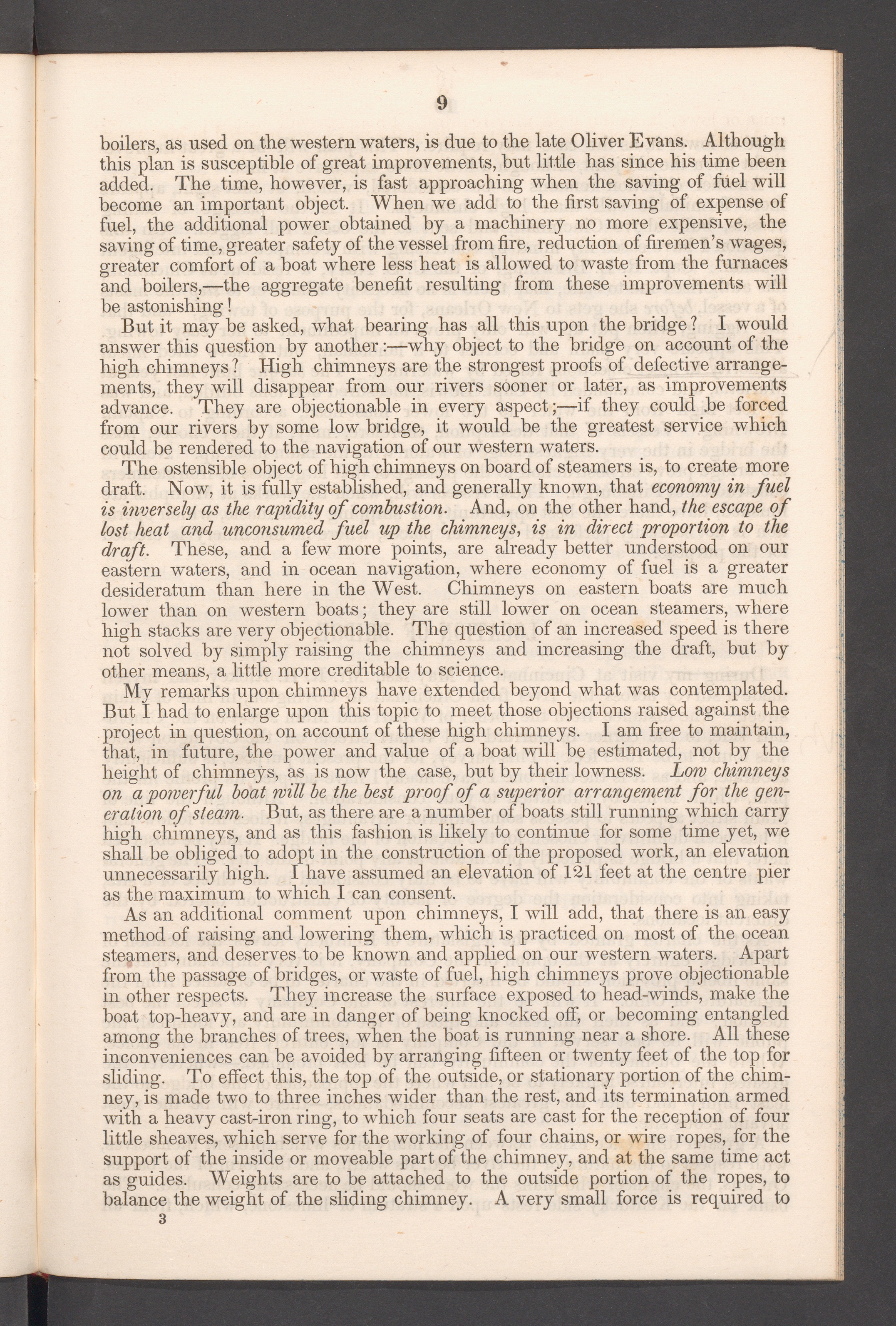 The ostensible object of high chimneys on board of steamers is, to create moredraft. Now, it is fully established, and generally known, that economy in fuelis inversely as the rapidity of combustion. And, on the other hand, the escape oflost heat and unconsumed fuel up the chimneys , is in direct proportion to thedraft. These, and a few more points, are already better understood on oureastern waters, and in ocean navigation, where economy of fuel is a greaterdesideratum than here in the West. Chimneys on eastern boats are muchlower than on western boats; they are still lower on ocean steamers, wherehigh stacks are very objectionable. The question of an increased speed is therenot solved by simply raising the chimneys and increasing the draft, but byother means, a little more creditable to science.