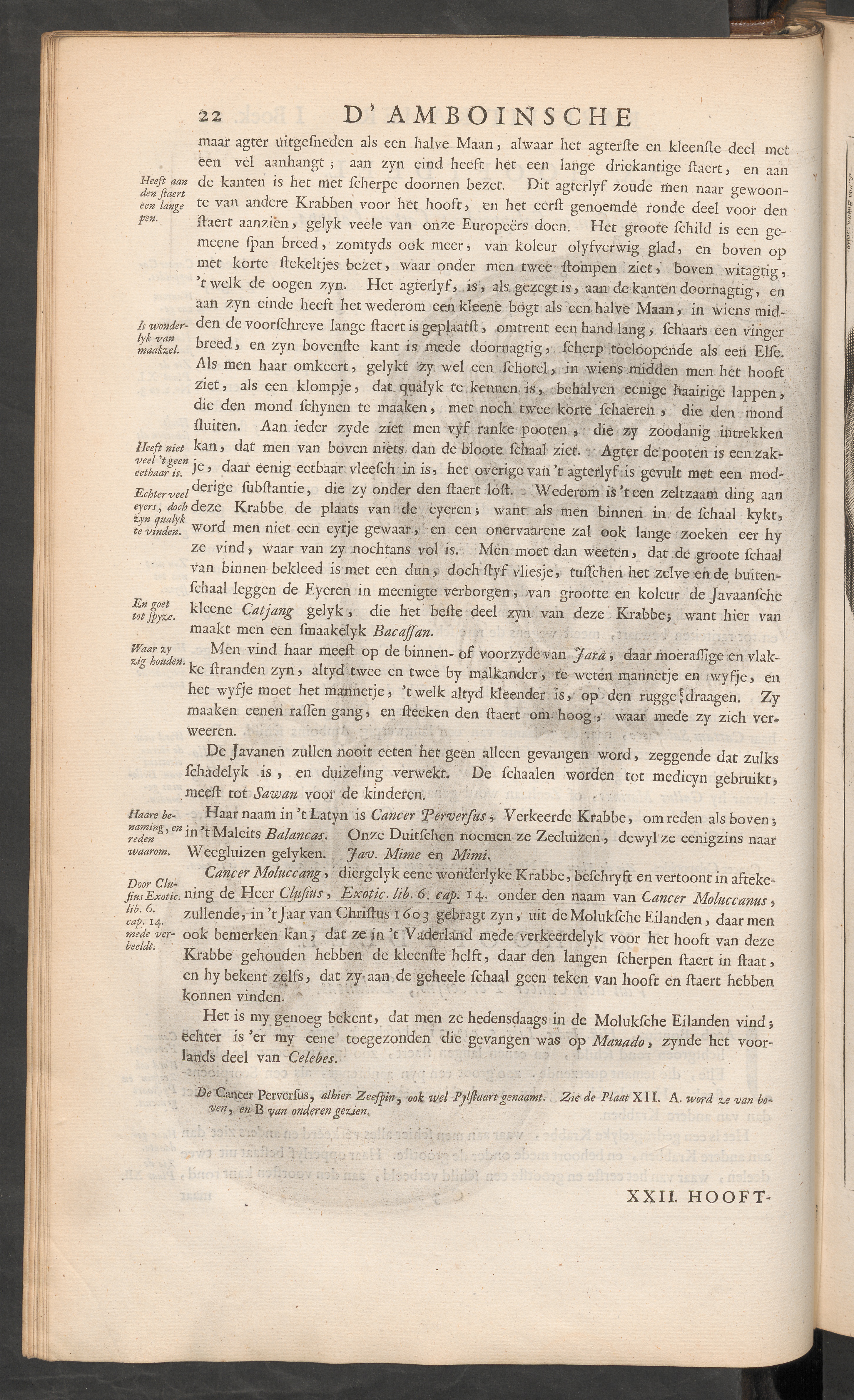 Cancer Moluccang-, diergelyk eene wonderlykc Krabbe, befchryft en vertoont in afteke-siusExotL ning de Heer Clujws , Exotic. lih. 6 . cap. 14. onder den naam van Cancer Moine canns ,zullende y in’tjaar van Christus i do 3 gebragt zyn, uit de Moluksche Eilanden , daar menook bemerken kan, dat ze in ’t Vaderland mede verkeerdelyk voor het hooft van dezeKrabbe gehouden hebben de kleenste helft, daar den langen scherpen staert in staat,en hy bekent zelfs, dat zy*aan de gehecle schaal geen teken van hooft en staert hebbenkonnen vinden. S