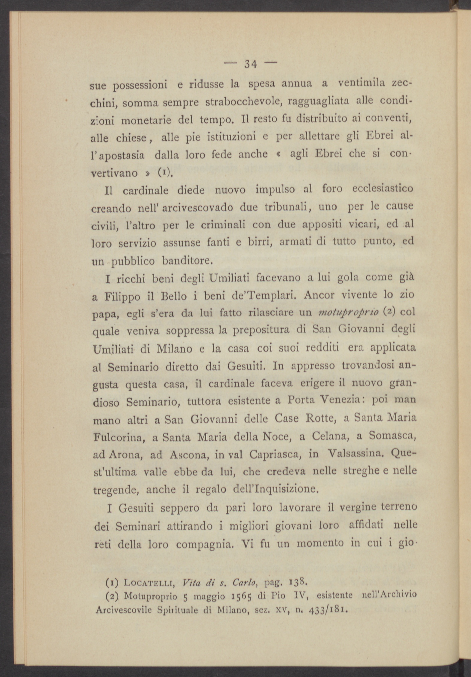 I ricchi beni degli Umiliati facevano a lui gola come giàa Filippo il Bello i beni de'Templari . Ancor vivente lo ziopapa, egli s’era da lui fatto rilasciare un motuproprio ( 2 ) colquale veniva soppressa la prepositura di San Giovanni degliUmiliati di Milano e la casa coi suoi redditi era applicataal Seminario diretto dai Gesuiti . In appresso trovandosi an-gusta questa casa, il cardinale faceva erigere il nuovo gran-dioso Seminario , tuttora esistente a Porta Venezia: poi manmano altri a San Giovanni delle Case Rotte, a Santa MariaFulcorina, a Santa Maria della Noce, a Celana, a Somasca,ad Arona, ad Ascona , in vai Capriasca , in Valsassina. Que-st'ultima valle ebbe da lui, che credeva nelle streghe e nelletregende, anche il regalo dell’Inquisizione .