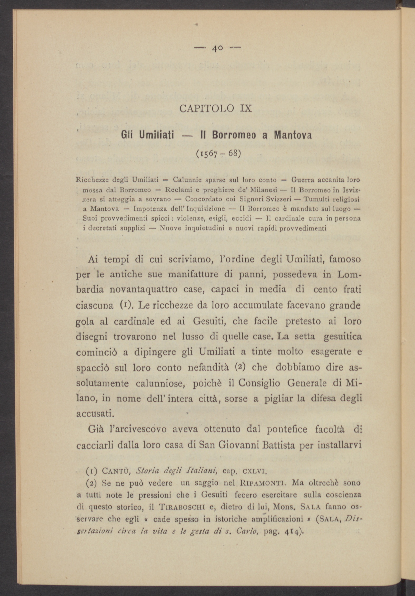 Ai tempi di cui scriviamo, l'ordine degli Umiliati, famosoper le antiche sue manifatture di panni, possedeva in Lom bardia novantaquattro case, capaci in media di cento fraticiascuna (0. Le ricchezze da loro accumulate facevano grandegola al cardinale ed ai Gesuiti , che facile pretesto ai lorodisegni trovarono nel lusso di quelle case. La setta gesuiticacominciò a dipingere gli Umiliati a tinte molto esagerate espacciò sul loro conto nefandità ( 1 2 ) che dobbiamo dire as-solutamente calunniose, poiché il Consiglio Generale di Mi lano , in nome dell’ intera città, sorse a pigliar la difesa degliaccusati.