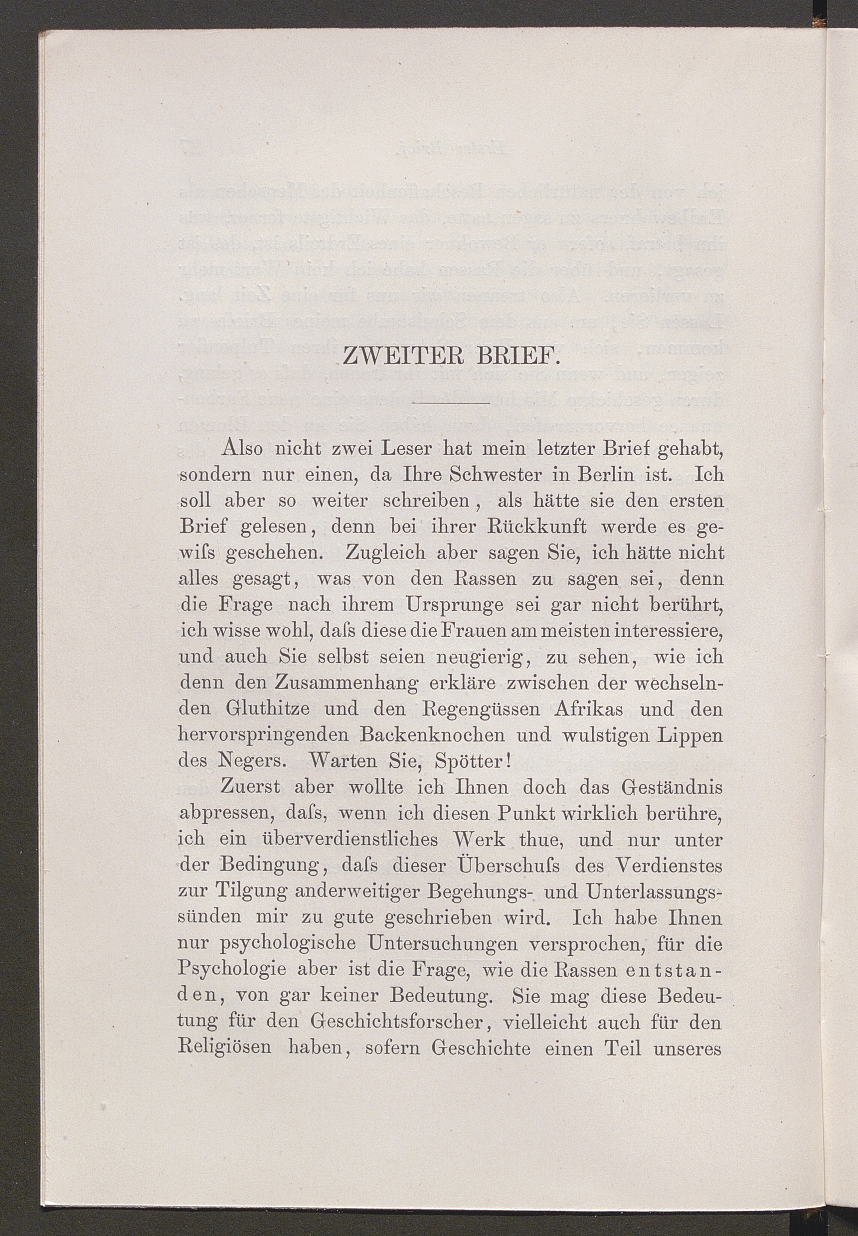 Also nicht zwei Leser hat mein letzter Brief gehabt,sondern nur einen, da Ihre Schwester in Berlin ist. Ichsoll aber so weiter schreiben , als hätte sie den erstenBrief gelesen, denn bei ihrer Rückkunft werde es ge-wifs geschehen. Zugleich aber sagen Sie, ich hätte nichtalles gesagt, was von den Rassen zu sagen sei, denndie Frage nach ihrem Ursprünge sei gar nicht berührt,ich wisse wohl, dafs diese die Frauen am meisten interessiere,und auch Sie selbst seien neugierig, zu sehen, wie ichdenn den Zusammenhang erkläre zwischen der wechseln-den Gluthitze und den Regengüssen Afrikas und denhervorspringenden Backenknochen und wulstigen Lippendes Negers. Warten Sie, Spötter!
