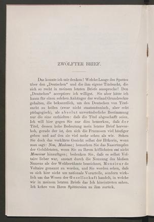 Das konnte ich mir denken! Weiche Lauge des Spottesüber den „Deutschen “ und die ihm eigene Titelsucht, diesich so recht in meinem letzten Briefe ausspreche! Den„Deutschen “ acceptiere ich willigst. Sie aber hätte ichkaum für einen solchen Anhänger der weiland Grundrechtegehalten, die bekanntlich, um den Deutschen von Titel-sucht zu heilen (zwar nicht staatsmännisch, aber echtpädagogisch), als absolut unveränderliche Bestimmungnur die eine enthielten: dafs die Titel abgeschafft seien.Ich will hier gegen Sie nur dies bemerken, dafs derTitel, dessen hohe Bedeutung mein letzter Brief hervor-hob, gerade der ist, den sich die Franzosen viel häufigergeben und auf den sie viel mehr sehen als wir. SehenSie doch das verklärte Gesicht selbst der Hökerin, wennman sagt: Non, Madame; bemerken Sie das Naserümpfender Gebildetsten, wenn Sie zu Ihrem höflichsten oui nichtMonsieur hinzufügen-, bedenken Sie, dafs es selbst Vol-taire lieber war, anstatt durch die Nennung des blofsenNamens als der Weltberühmte bezeichnet, Monsieur deVoltaire genannt zu werden, und Sie werden sehen, dafses sich hier nicht um nationale Vorurteile, sondern wirk-lich um das Wesen der Gesellschaft handelt, in welchewir in meinem letzten Briefe das Ich hineintreten sahen.Ich kehre von Ihren Spöttereien zu ihm zurück.