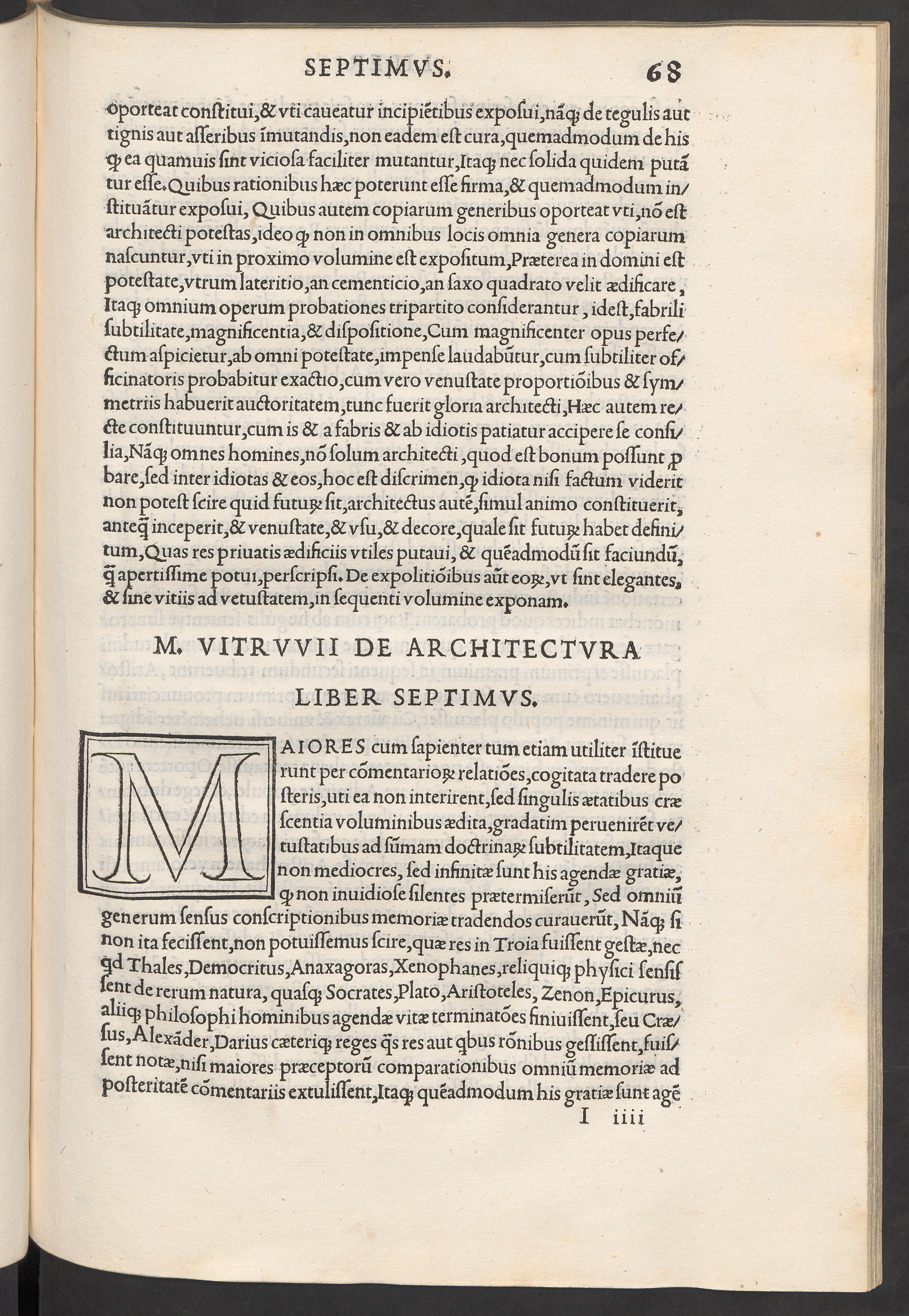 SEPTIMVS.68oporteat constitui,& vti caueatur incipientibus exposui, namque de tegulis auttignis aut asseribus imutandis, non eadem est cura, quemadmodum de hisquod ea quamuis sint viciosa faciliter mutantur, Itaque nec solida quidem putamtur esse. Quibus rationibus haec poterunt esse firma,& quemadmodum in-stituantur exposui, Quibus autem copiarum generibus oporteat vti, non estarchitecti potestas, ideo quod non in omnibus locis omnia genera copiarumnascuntur, vti in proximo volumine est expositum, Praeterea in domini estpotestate, vtrum lateritio, an cementicio, an saxo quadrato velit aedificare,Itaque omnium operum probationes tripartito considerantur, idest, fabrilisubtilitate, magnificentia,& dispositione, Cum magnificenter opus perfe-ctum aspicietur, ab omni potestate, impense laudabuntur, cum subtiliter of-ficinatoris probabitur exactio, cum vero venustate proportionibus& sym-metriis habuerit auctoritatem, tunc fuerit gloria architecti, Haec autem re-cte constituuntur, cum is& a fabris& ab idiotis patiatur accipere se consi-lia, Namque omnes homines, non solum architecti, quod est bonum possunt probare, sed inter idiotas& eos, hoc est discrimen, quod idiota nisi factum videritnon potest scire quid futur, sit, architectus autem, simul animo constituerit,antequam inceperit,& venustate,& vsu,& decore, quale sit futurum habet defini-tum, Quas res priuatis aedificiis vtiles putaui,& quemadmodum sit faciundum,quam apertissime potui, perscripsi. De expolitionibus autem eorum, vt sint elegantes,& sine vitiis ad vetustatem, in sequenti volumine exponam.M. VITRVII DE ARCHITECTVRALIBER SEPTIMVS.AIORES cum sapienter tum etiam utiliter instituerunt per commentariorum relationes, cogitata tradere posteris, uti ea non interirent, sed singulis aetatibus craescentia voluminibus aedita, gradatim peruenirent ve-tustatibus ad summam doctrinarum subtilitatem, Itaquenon mediocres, sed infinitae sunt his agendae gratiae,quod non inuidiose silentes praetermiserunt, Sed omniumgenerum sensus conscriptionibus memoriae tradendos curauerunt, Namque sinon ita fecissent, non potuissemus scire, quae res in Troia fuissent gestae, necquid Thales, Democritus, Anaxagoras, Oenophanes, reliquique physici sensissent de rerum natura, quasque Socrates, Plato, Aristoteles, Zenon, Epicurus,aliique philosophi hominibus agendae vitae terminationes finiuissent, seu Crae-sus, Alexander, Darius caeterique reges quae res aut quibus ronnibus gessissent, fuis-sent notae, nisi maiores praeceptorum comparationibus omnium memoriae adposteritatem commentariis extulissent, Itaque quemadmodum his gratiae sunt agemI iiii
