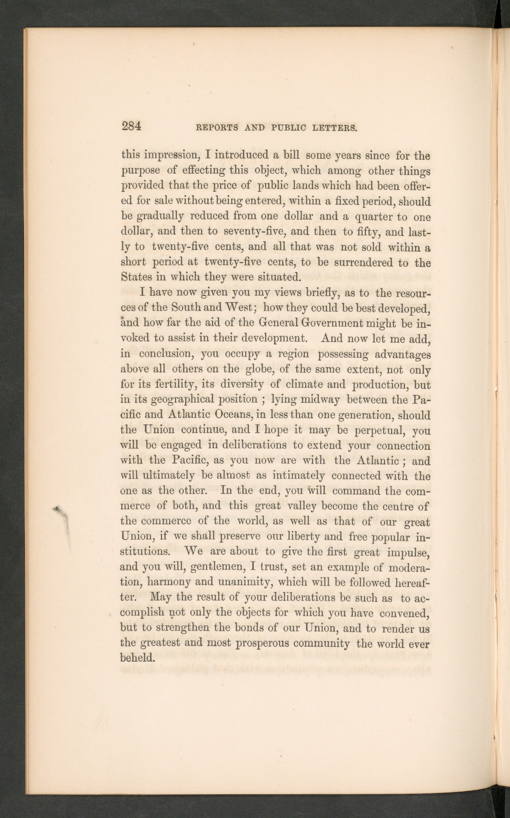 I have now given you my views briefly, as to the resour-ces of the South and West; how they could be best developed,and how far the aid of the General Government might be in-voked to assist in their development. And now let me add,in conclusion, you occupy a region possessing advantagesabove all others on the globe, of the same extent, not onlyfor its fertility, its diversity of climate and production, butin its geographical position ; lying midway between the Pa-cific and Atlantic Oceans , in less than one generation, shouldthe Union continue, and I hope it may be perpetual, youwill be engaged in deliberations to extend your connectionwith the Pacific, as you now are with the Atlantic ; andwill ultimately be almost as intimately connected with theone as the other. In the end, you will command the com-merce of both, and this great valley become the centre ofthe commerce of the world, as well as that of our greatUnion, if we shall preserve our liberty and free popular in-stitutions. We are about to give the first great impulse,and you will, gentlemen, I trust, set an example of modera-tion, harmony and unanimity, which will be followed hereaf-ter. May the result of your deliberations be such as to ac-complish not only the objects for which you have convened,but to strengthen the bonds of our Union, and to render usthe greatest and most prosperous community the world everbeheld.