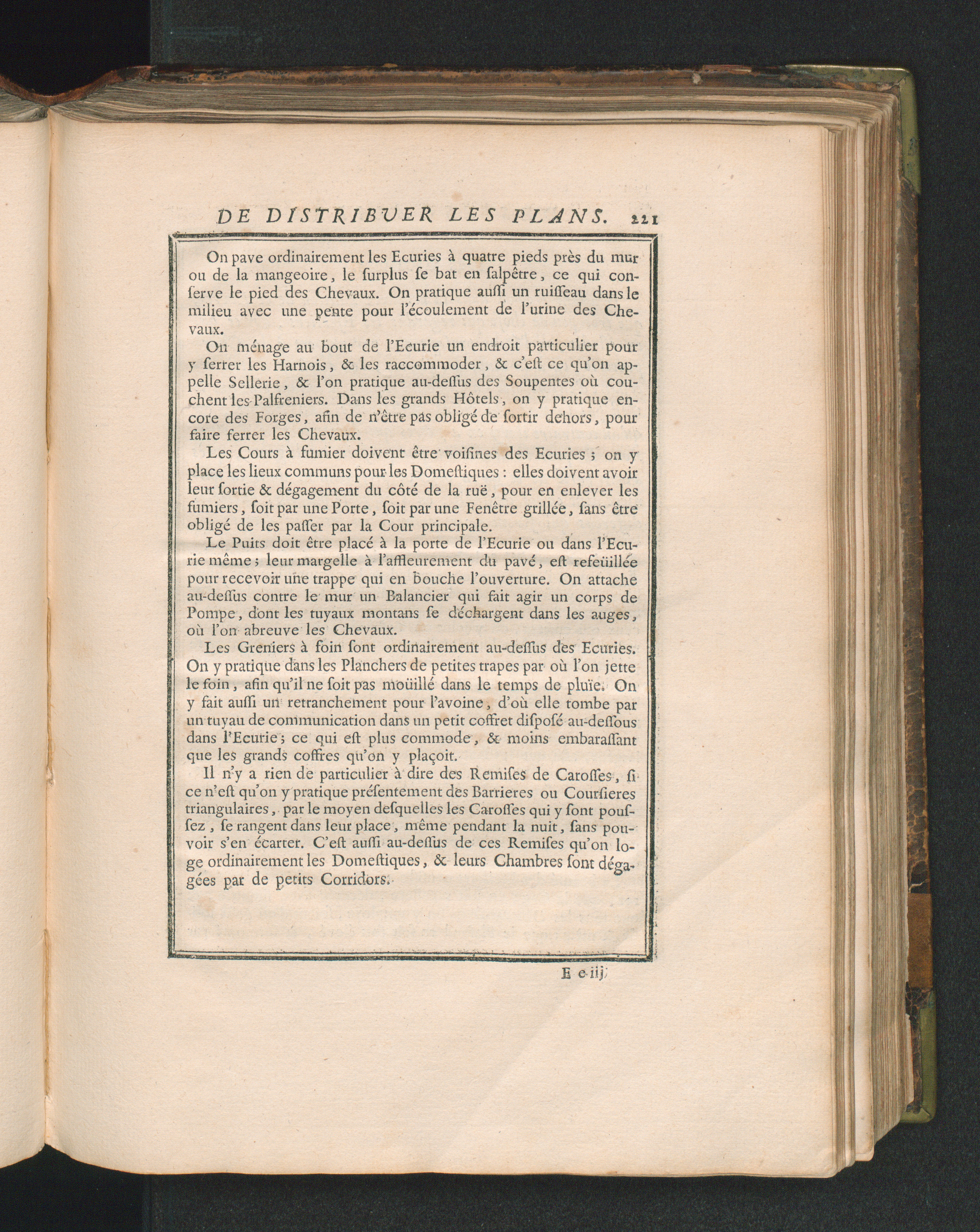 11 n’y a rien de particulier à dire des Remises de Caresses , sice n’est qu’on y pratique présentement des Barrières ou Coursiérestriangulaires, par le moyen defquelles les Carosses qui y font pouf-fez , se rangent dans leur place, même pendant la nuit, fans pou-voir s’en écarter. C’est aussi au-dessus de ces Remises qu’on lo-ge ordinairement les Domestiques, & leurs Chambres font déga-gées par de petits Corridors.