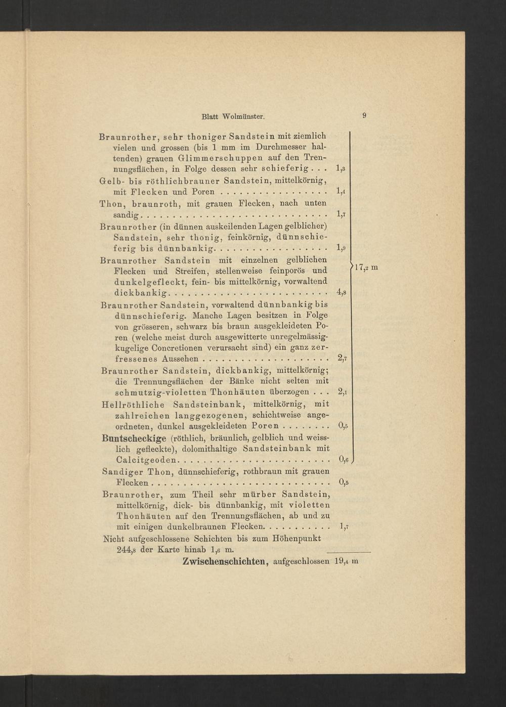 Braunrother, sehr thoniger Sandstein mit ziemlichvielen und grossen (bis 1 mm im Durchmesser hal-tenden) grauen Glimmerschuppen auf den Tren-nungsflächen, in Folge dessen sehr schieferig. . . l,sGelb- bis röthlichbrauner Sandstein, mittelkörnig,