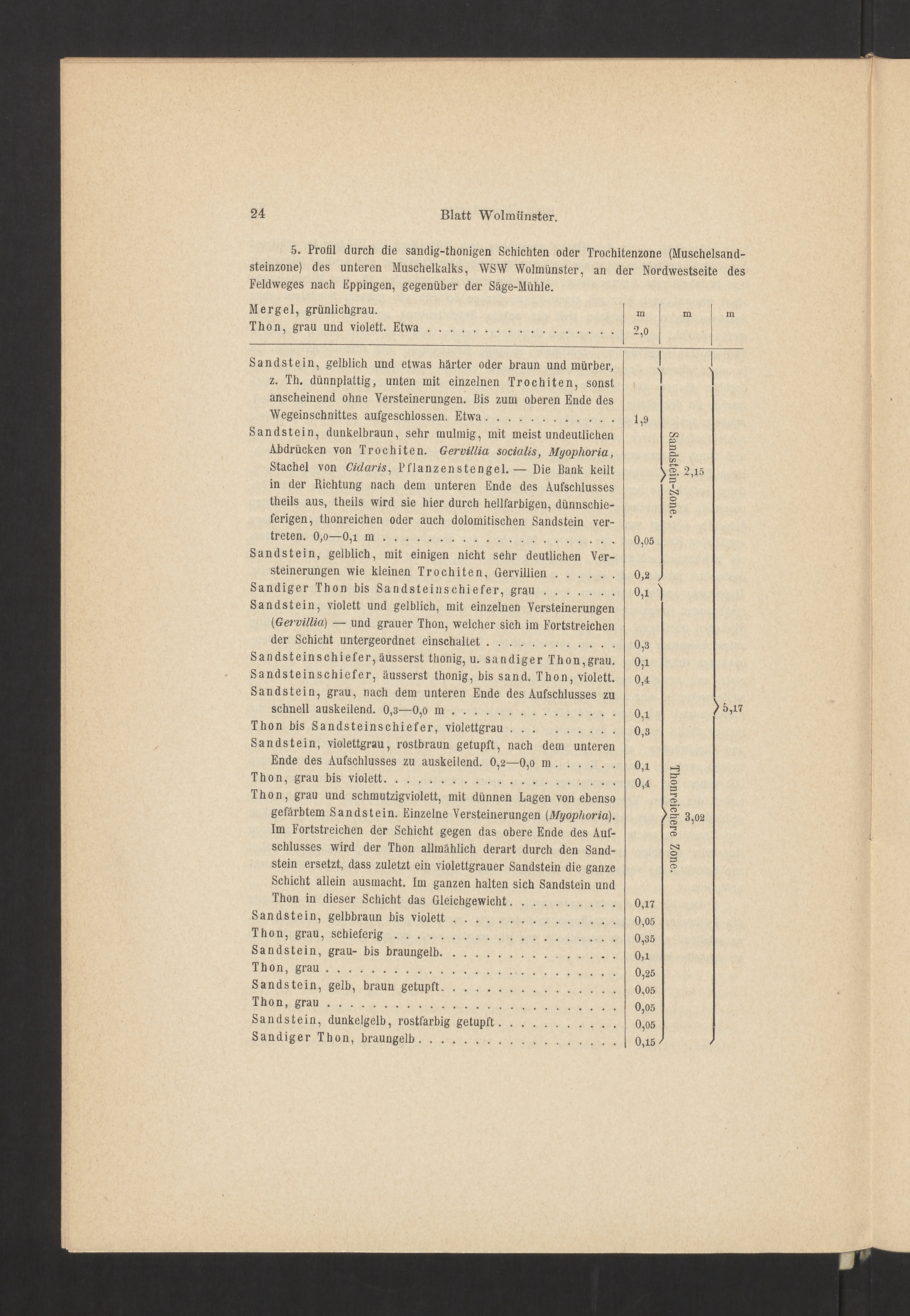 5. Profil durch die sandig-thonigen Schichten oder Trochitenzone (Muschelsand-steinzone) des unteren Muschelkalks, WSW Wolmünster, an der Nordwestseite desFeldweges nach Uppingen, gegenüber der Säge-Mühle.