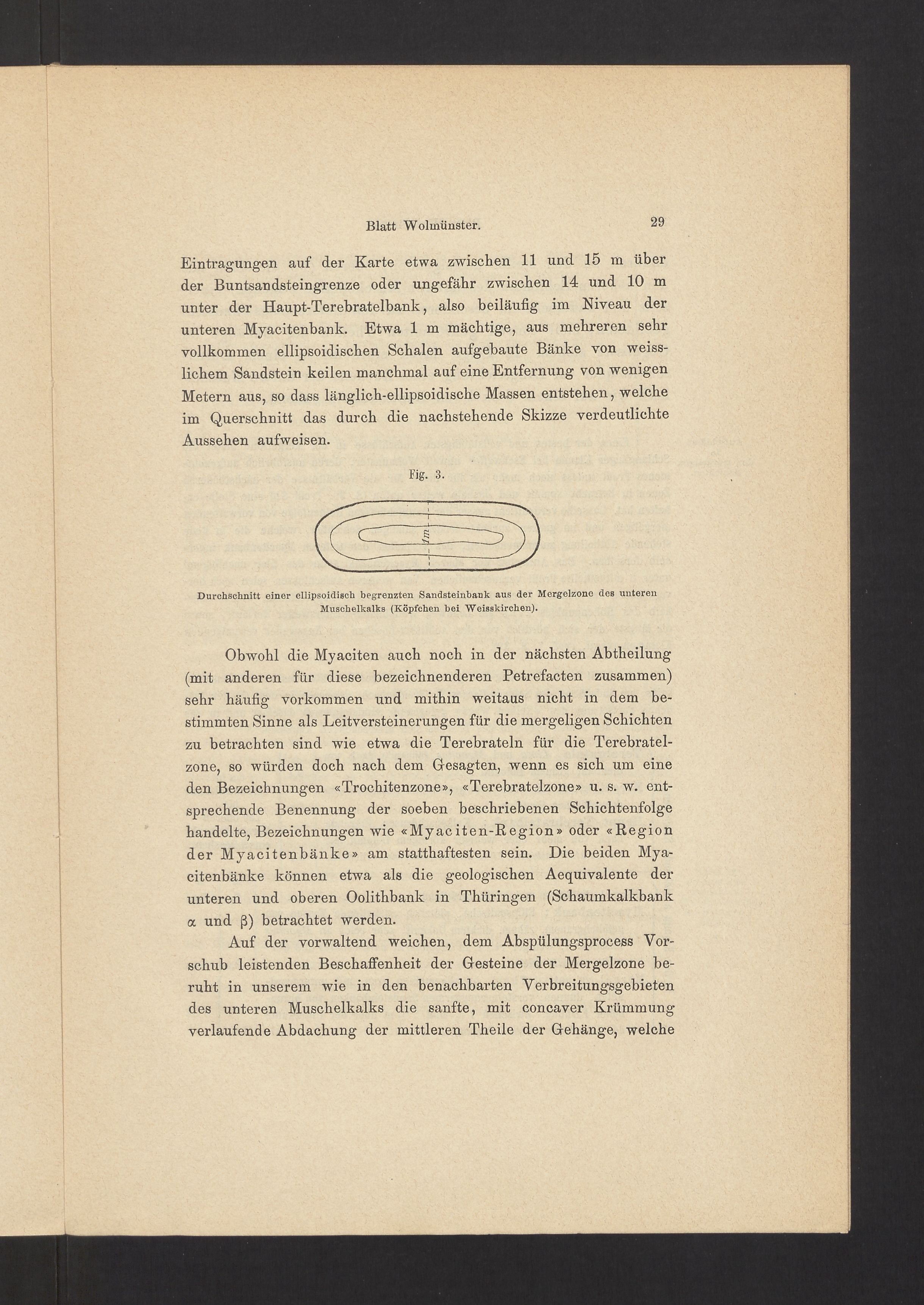 Eintragungen auf der Karte etwa zwischen 11 und 15 m überder Buntsandsteingrenze oder ungefähr zwischen 14 und 10 munter der Haupt-Terebratelbank, also beiläufig im Niveau derunteren Myacitenbank. Etwa 1 m mächtige, aus mehreren sehrvollkommen ellipsoidischen Schalen aufgebaute Bänke von weiss-lichem Sandstein keilen manchmal auf eine Entfernung von wenigenMetern aus, so dass länglich-ellipsoidische Massen entstehen, welcheim Querschnitt das durch die nachstehende Skizze verdeutlichteAussehen aufweisen.