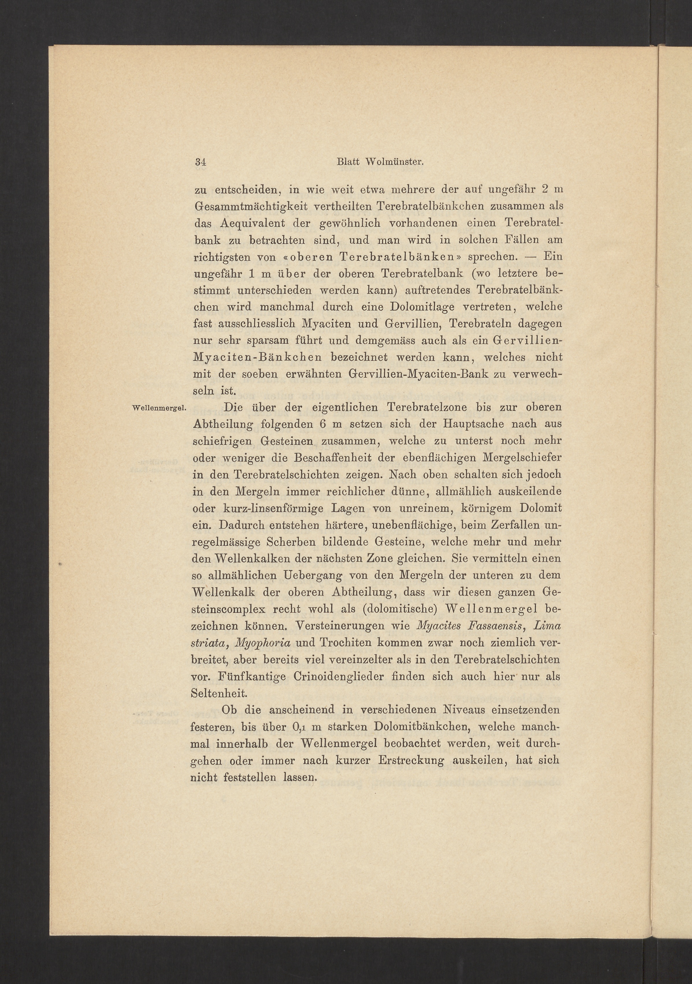 Abtheilung folgenden 6 m setzen sich der Hauptsache nach ausschiefrigen Gesteinen zusammen, welche zu unterst noch mehroder weniger die Beschaffenheit der ebenflächigen Mergelschieferin den Terebratelschichten zeigen. Nach oben schalten sich jedochin den Mergeln immer reichlicher dünne, allmählich auskeilendeoder kurz-linsenförmige Lagen von unreinem, körnigem Dolomitein. Dadurch entstehen härtere, unebenflächige, beim Zerfallen un-regelmässige Scherben bildende Gesteine, welche mehr und mehrden Wellenkalken der nächsten Zone gleichen. Sie vermitteln einenso allmählichen Uebergang von den Mergeln der unteren zu demWellenkalk der oberen Abtheilung, dass wir diesen ganzen Ge-steinscomplex recht wohl als (dolomitische) Wellenmergel be-zeichnen können. Versteinerungen wie Myacites Fassaensis, Lima striata, Myophoria und Trochiten kommen zwar noch ziemlich ver-breitet, aber bereits viel vereinzelter als in den Terebratelschichtenvor. Fünfkantige Crinoidenglieder finden sich auch hier nur alsSeltenheit.