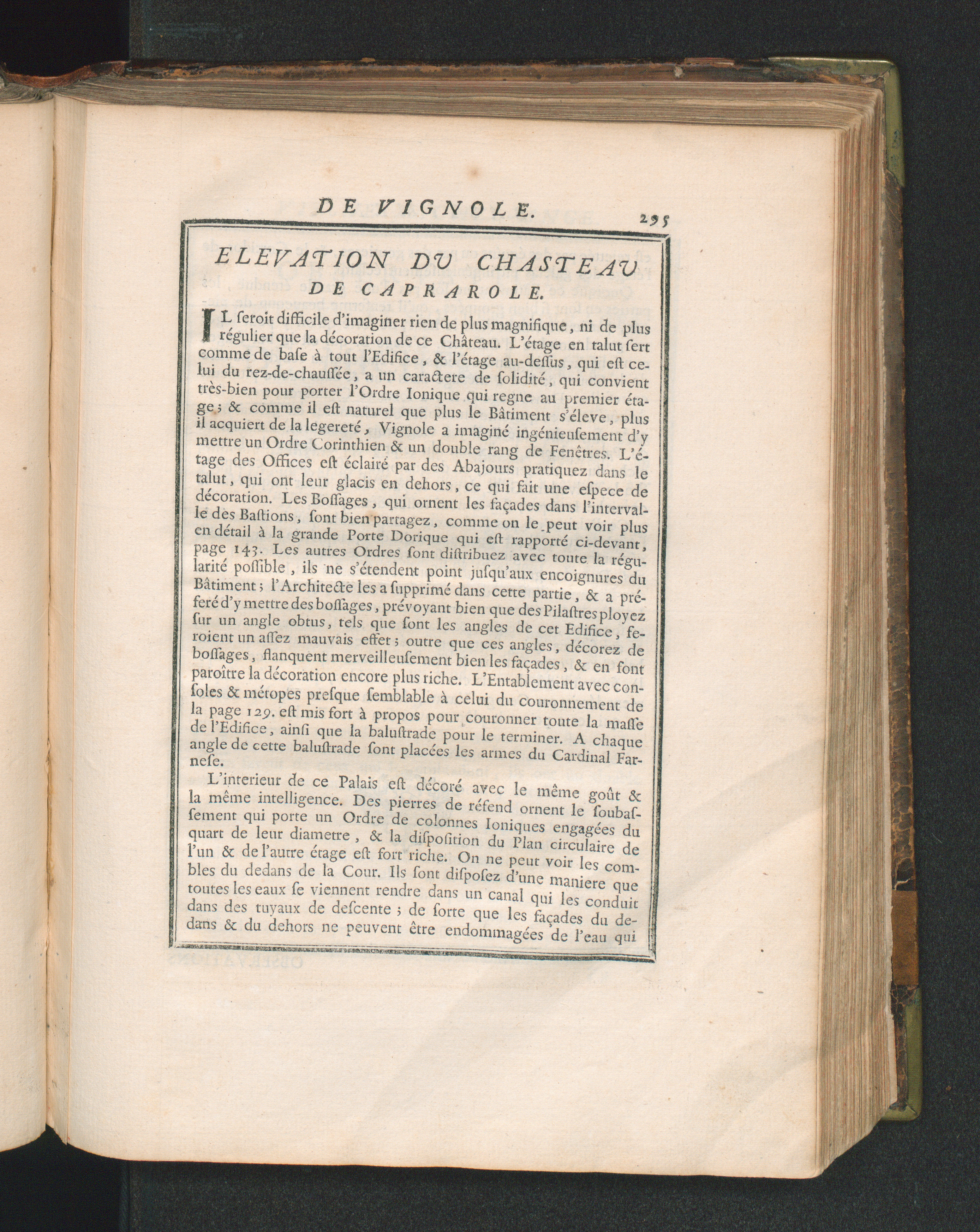 Í L feroít difficile d’imaginer rien de plus magnifique, ni de plusrégulier que la décoration de ce Château. L’étage en talut sertcomme de base à tout l’Edifice, & Pétage au-dessus, qui est ce-lui du rez-de-chaussée, a un caractère de solidité, qui convienttrès-bien pour porter l'Ordre Ionique qui régné au premier éta-ge.; Sc comme il est naturel que plus le Bâtiment s’éleve, plusil acquiert de la legereté, Vignole a imaginé ingénieusement d’ymettre un Ordre Corinthien & un double rang de Fenêtres. L’é-tage des Offices est éclairé par des Abajours pratiquez dans letalut, qui ont leur glacis en dehors, ce qui fait une espece dedécoration. Les Bossages , qui ornent les façades dans Pinterval-le des Bastions, font bien partagez, comme on le.peut voir plusen détail à la grande Porte Dorique qui est rapporté ci-devant,page 143. Les autres Ordres font distribuez avec toute la régu-larité possible , ils ne s’étendent point jusqu’aux encoignures duBâtiment; l’Architecte les a supprimé dans cette partie, & a pré-féré d’y mettre des bossages, prévoyant bien que des Pilastres ployezfur un angle obtus, tels que font les angles de cet Edifice, fe-roient un assez mauvais effet ; outre que ces angles, décorez debossages, flanquent merveilleusement bien les façades, & en fontparoître la décoration encore plus riche. L’Entabíement avec con-soles & métopes presque semblable à celui du couronnement dela page 129. est mis fort à propos pour couronner toute la malledel'Edifice, ain fi que la balustrade pour le terminer. A chaqueangle de cette balustrade sont placées les armes du Cardinal Far-nefe.