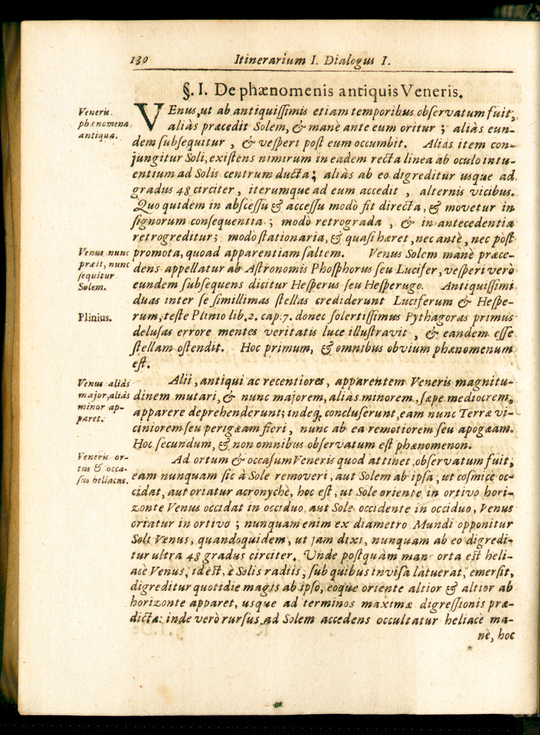 Vourit T 7 Enus,ut ab antiquissimis etiam temporibus observatum fuit ;pb cncmina y alias pracedit Solem , & mane ante eum oritur ; altas eun-«ntiqu*. subsequitur , cr vejpen poft eum occumbit. Alias item con-jungitur Soli, exi flens nimirum tn eadem rett a linea ab oculo in tu-entium ad Solis centrum dutta J alias ab eo digreditur usque ad.gradus 48 ctrciter , it erumque ad eum accedit , alternis vicibus .Jpuo quidem tn abscessu g? accejju modo fit diretta , gf movetur in>signorum consequentia ; modo retrograda , <y> tn antecedentiaretrogredttur > modo ftationaria, gf quafi bxret , nec ante , nec fio fiVtnu* num promota, quoad apparentiam j ait em. Venus Solem mane prace-