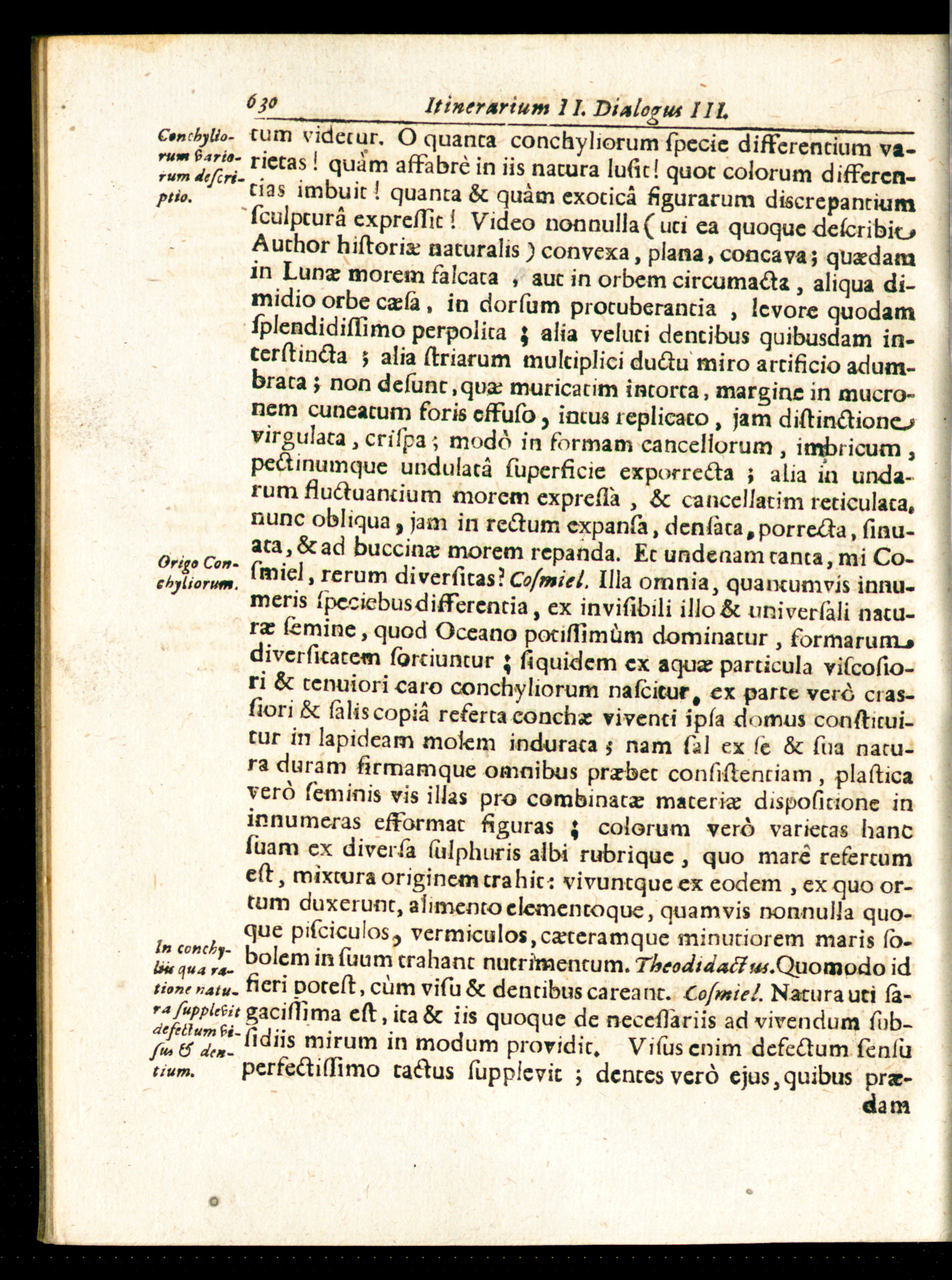 CtnchjUo- tum videtur. O quanta conchyliorum specie differentium va-rum Siria- rietas! quam affabre in iis natura lusit! quot colorum differen-T ptio. ^'cias imbuit! quanta & quam exotica figurarum discrepantium'sculptura expressit i Video nonnulla( uti ea quoque defcribioAuthor historia: naturalis) convexa, plana, concava; quaedamin Lunae inorem falcata , aut in orbem circumacta, aliqua di-midio orbe caela. in dorsum protuberantia , levore quodamsplendidissimo perpolita \ alia veluti dentibus quibusdam in-terstincta ; alia striarum multiplici ductu miro artificio adum-brata ; non delunt.quae muricatim intorta, margine in mucro-nem cuneatum foris effuso, intus replicato, jam distinctionovirgulata,crispa', modo in formam cancellorum , imbricum ,pectinumque undulata superficie exporrecta ; alia in unda-rum fluctuantium morem expressa , & cancellatim reticulata,nunc obliqua, jam in rectum expansa, deniata,porrecta, sinu-ata , & ad buccinae morem repanda. Et undenam tanta, mi Co-chitiorum ' rerum diversitas? Cofmiel. Illa omnia, quantumvis innu-meris »pcciebusdiffercntia, ex invisibili illo & universali natu-ra: semine, quod Oceano potissimüm dominatur , formarum.»diversitatem sortiuntur ; siquidem ex aquae particula viscosio-ri & tenuiori caro conchyliorum nascitur, ex parce vero cras-siori & salis copia referta concha: viventi ipsa domus constitui-tur in lapideam molem indurata 5 nam sal ex se & sua natu-ra duram firmamque omnibus praebet confistenciam, plasticavero seminis vis illas pro combinatae materiae dispositione ininnumeras efformac figuras { colorum vero varietas hancsuam ex diversa sulphuris albi rubrique , quo mare refertumest, mixtura originem trahit: vivuntque ex eodem , ex quo or-tum duxerunt, alimento elementoque, quamvis nonnulla quo-que pisciculos, vermiculos,caeteramque minutiorem maris lo-btccnchj- bolcm in suum trahant nutrimentum. Theodtdafiut. Quomodo idtione ll*ü. fieri potest , cum visu Ac dentibus carea nt. Cofmiel. Natura uti la-r-*/i/>/>/fg,fgaciflima est, ita Ac iis quoque de neceflariis advivendum siib-"^“^*'sidiis mirum in modum providit. Visus enim desectum sensuuum. " perfectissimo tactus supplevit ; dentes vero ejus, quibus prae-dam