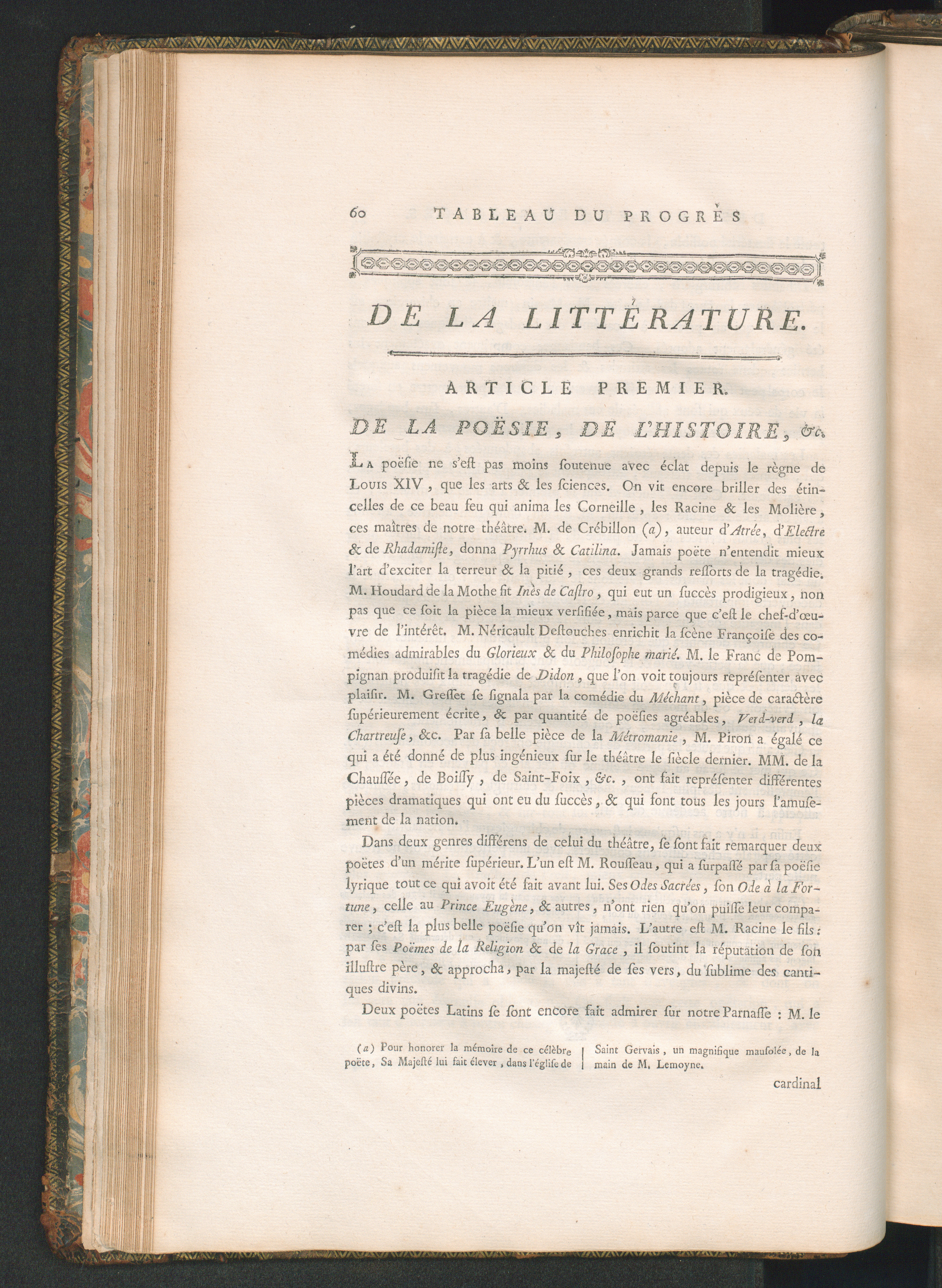 Dans deux genres différons de celui du théâtre, se sont fait remarquer deuxpoètes d’un mérite supérieur, L'un est M. Rousseau, qui a surpassé par sa poésielyrique tout ce qui avoit été sait avant lui. Ses Odes Sacrées , son Ode à la For-tune , celle au Prince Eugène , Sc autres, n'ont rien qu’on puisse leur compa-rer ; c'est la plus belle poésie qsson vît jamais. L’autre est M. Racine le fils :par ses Poèmes de la Religion Sc de la Grâce , il soutint la réputation de sonillustre père, Sc approcha, par la majesté de ses vers, du sublime des canti-ques divins.