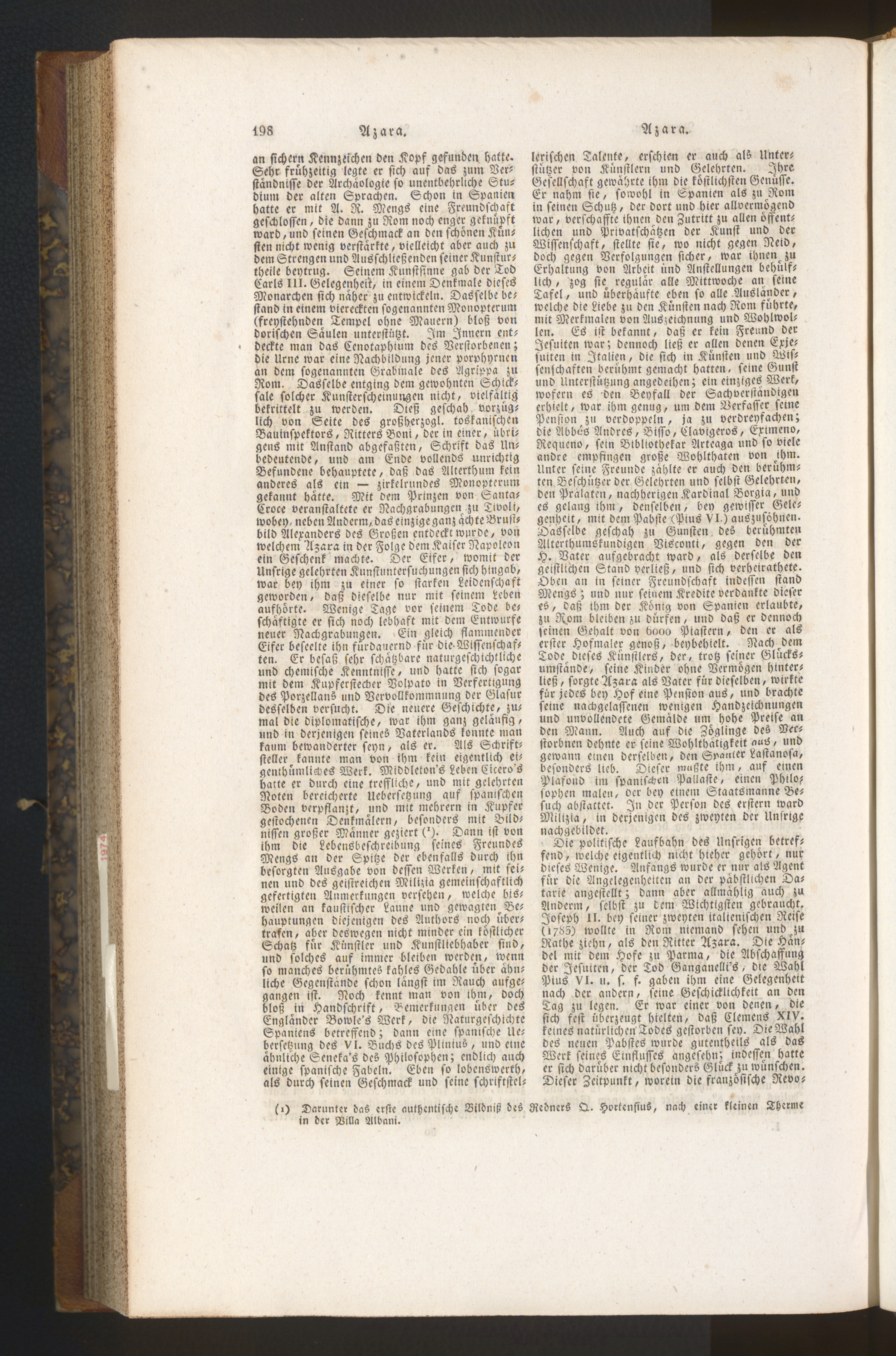 an sichern Kennzeichen den Kopf gefunden hatte-Sehr frühzeitig legte er sich auf das zum Ver-ständnisse der Archäologie so unentbehrliche Stu-dium der alten Sprachen. Schon in Spanien hatte er mit A. R. Mengs eine Freundschaftgeschlossen, die dann zu Rom noch enger geknüpftward, und seinen Geschmack an den schönen Kün-sten nicht wenig verstärkte, vielleicht aber auch zudem Strengen und Ausschließenden seiner Kunstur-theile beytrug. Seinem Kunstsinne gab der TodCarls III. Gelegenheit, in einem Denkmale diesesMonarchen sich näher zu entwickeln. Dasselbebe-stand in einem viereckten sogenannten Monopterum(freystehnden Tempel ohne Mauern) bloß vondorischen Säulen unterstützt. Im Innern ent-deckte man das Cenotaphium des Verstorbenen;die Urne war eine Nachbildung jener porphyrnenan dem sogenannten Grabmale des Agrippa zuRom . Dasselbe entging dem gewohnten Schick-sale solcher Kunfferscheinungen nicht, vielfältigbekrittelt zu werden. Dieß geschah vorzüg-lich von Seite des großherzvgl. toskanischenBauinspektors, Ritters Boni, der in einer, übri-gens mit Anstand abgefaßten, Schrift das Un-bedeutende, und am Ende vollends unrichtigBefundene behauptete, daß das Alterthum keinanderes als ein — zirkelrundes Monopterumgekannt hätte. Mit dem Prinzen von Santa-Croce veranstaltete er Nachgrabungen zu Tivoli,wobey, neben Anderm, das einzige ganz achte Brust-bild Alexanders des Großen entdeckt wurde, vonwelchem Azara in der Folge dem Kaiser Napoleon ein Geschenk machte. Der Eifer, womit derUnsrige gelehrten Kunstuntersuchungen sich hingab,war bey ihm zu einer so starken Leidenschaftgeworden, daß dieselbe nur mit seinem Lebenaufhörte. Wenige Tage vor seinem Tode be-schäftigte er sich noch lebhaft mit dem Entwürfeneuer Nachgrabungen. Ein gleich flammenderEifer beseelte ihn fürdaucrnd für die-Wissenschaf-ten. Er besaß sehr schätzbare naturgeschichklicheund chemische Kenntnisse, und hatte sich sogarmit dem Kupferstecher Volpato in Verfertigungdes Porzellans und Vervollkommnung der Glasurdesselben versucht. Die neuere Geschichte, zu-mal die diplomatische, war ihm ganz geläufig,und in derjenigen seines Vaterlands konnte mankaum bewanderter seyn, als er. Als Schrift-steller kannte man von ihm kein eigentlich ei-genthümliches Werk. Middleton's Leben Cicero'shakte er durch eine treffliche, und mit gelehrtenNoten bereicherte Uebersetzung auf spanischen Boden verpflanzt, und mit mcbrern in Kupfergestochenen Denkmälern, besonders mit Bild-nissen großer Männer geziert (I. Dann ist vonihm die Lebensbeschreibung seines FreundesMengs an der Spitze der ebenfalls durch ihnbesorgten Ausgabe von dessen Werken, mit fei-nen und des geistreichen Milizia gemeinschaftlichgefertigten Anmerkungen versehen, welche bis-weilen an kaustischer Laune und gewagten Be-hauptungen diejenigen des Authors noch über-trafen, aber deswegen nicht minder ein köstlicherSchatz für Künstler und Kunstliebhaber sind,und solches auf immer bleiben werden, wennso manches berühmtes kahles Gedable über ähn-liche Gegenstände schon längst im Rauch aufge-gangen ist. Noch kennt man von ihm, dochbloß in Handschrift, Bemerkungen über desEngländer Bowle's Werk, die NaturgeschichteSpaniens betreffend; dann eine spanische Ue-bersetzung des VI. Buchs des PliniuS , und eineähnliche Seneka's deS Philosophen; endlich aucheinige spanische Fabeln. Eben so lobenswerth,als durch seinen Geschmack und seine schriftstcl-